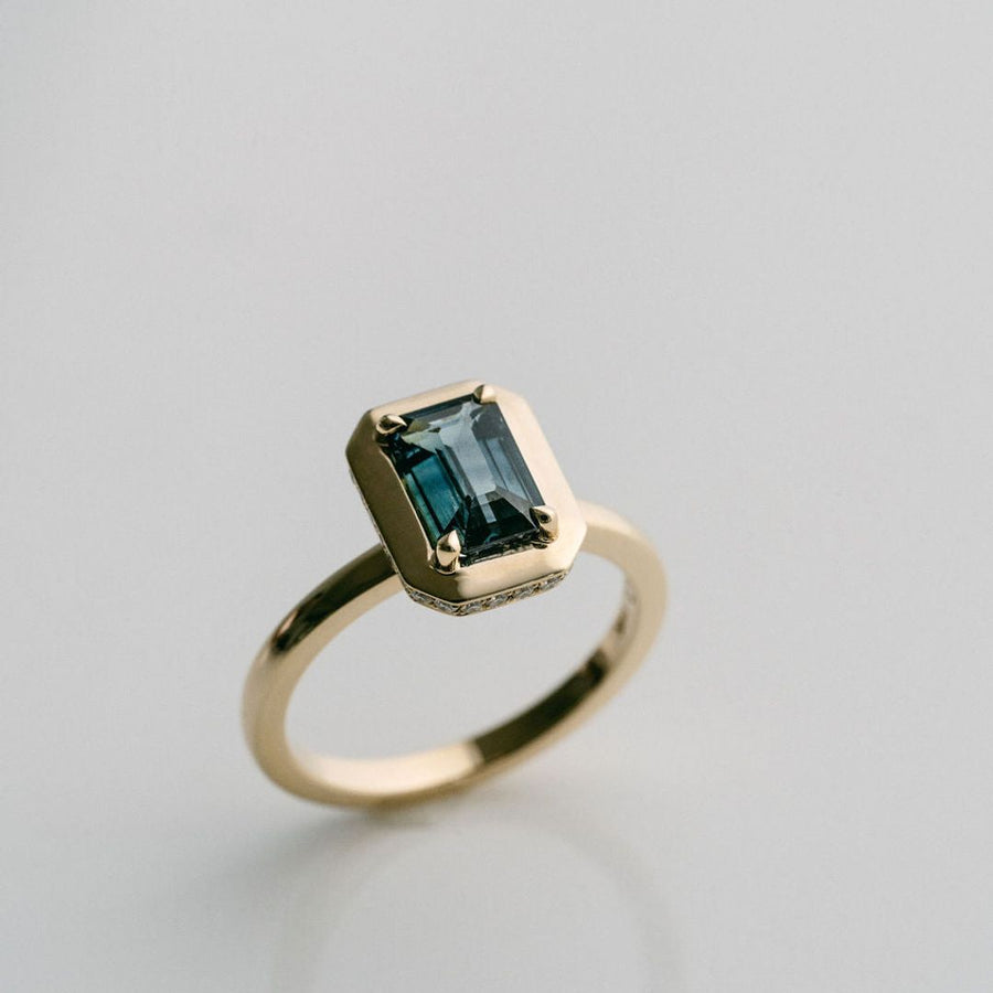 Emerald Cut Blue-Green Sapphire With Solid Gold Halo and Diamond Collar