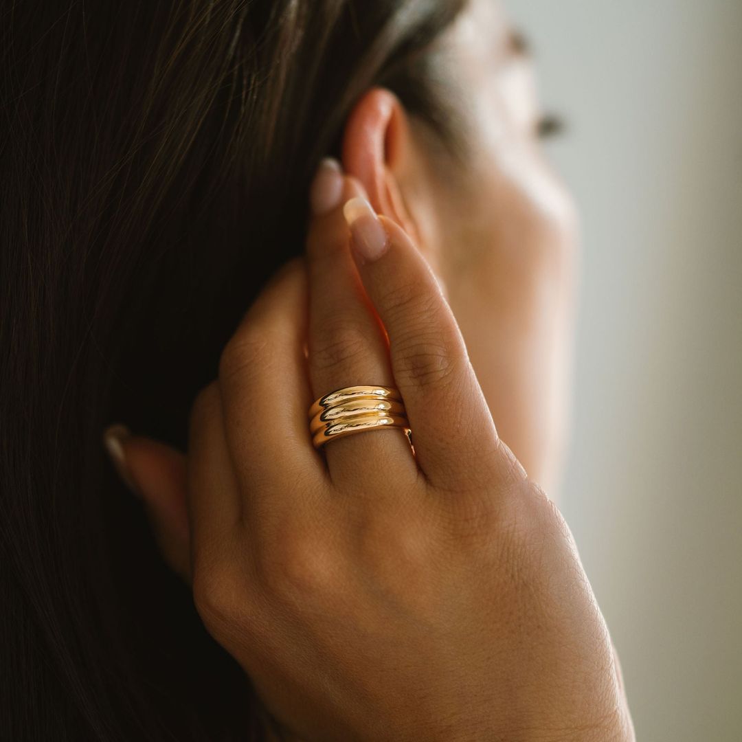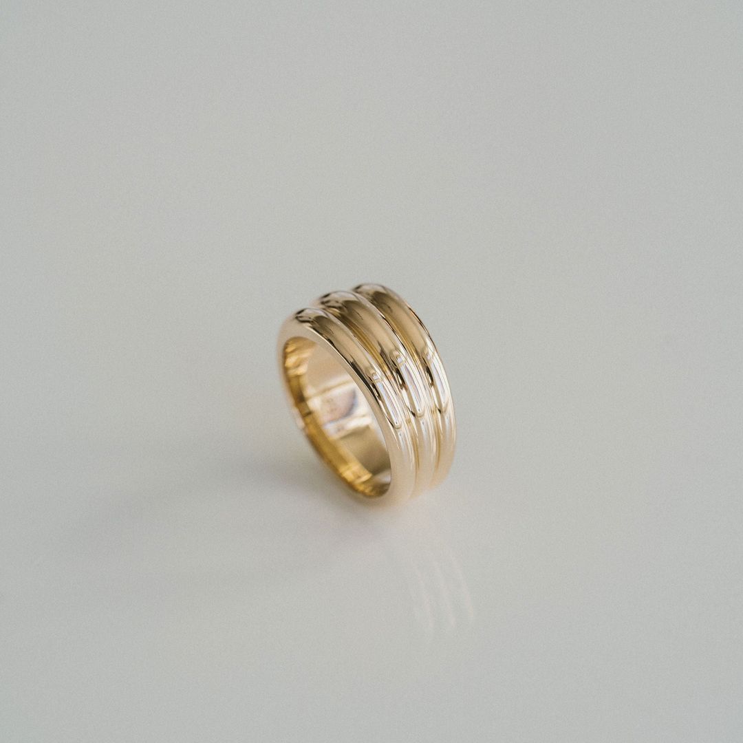 The thick, domed and tapered detail of the Aria gold band is designed for a balanced and substantial, weighty feel. This ring is as much a statement as it is a forever piece. Style as a chunky wedding band or accessory ring for any finger.