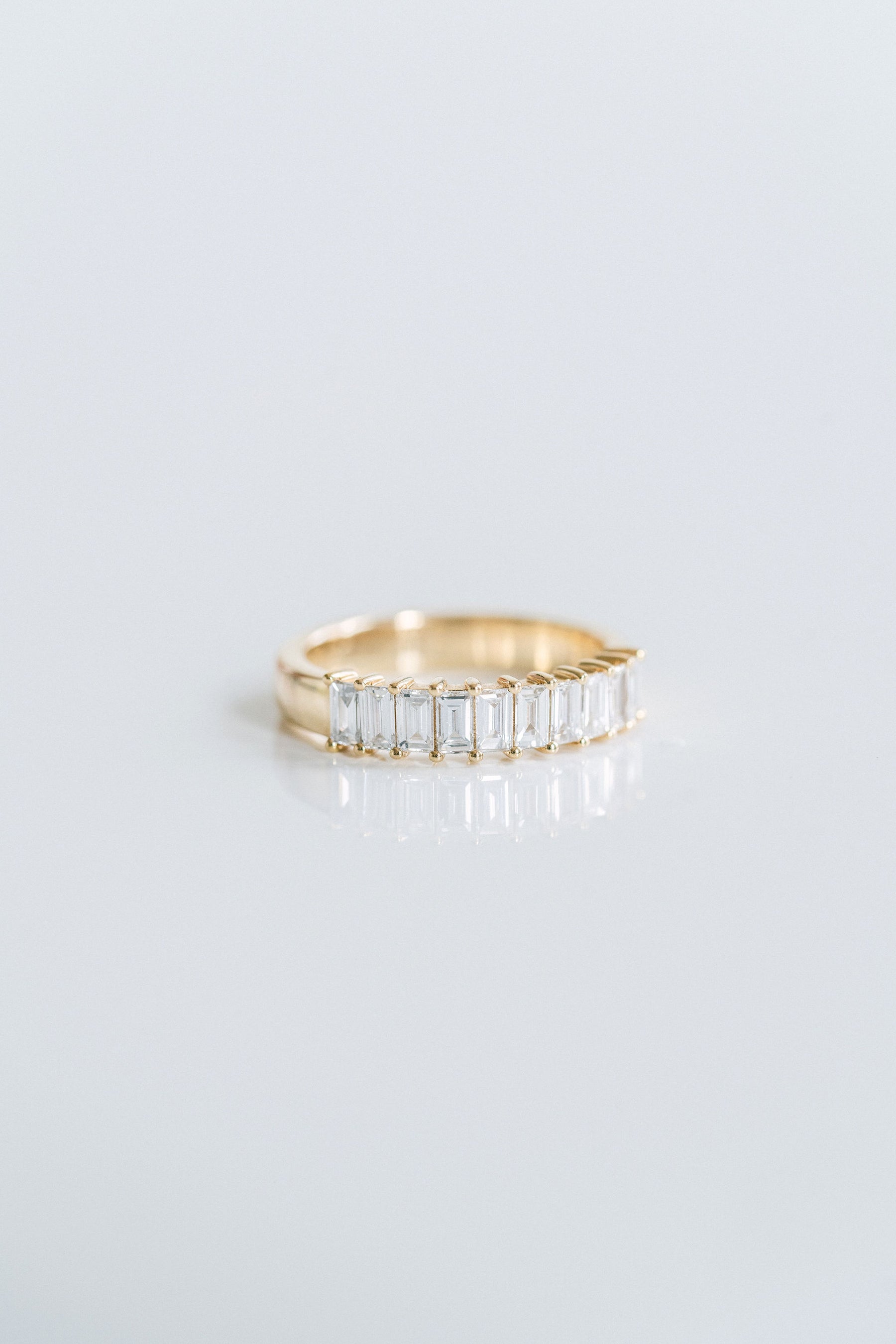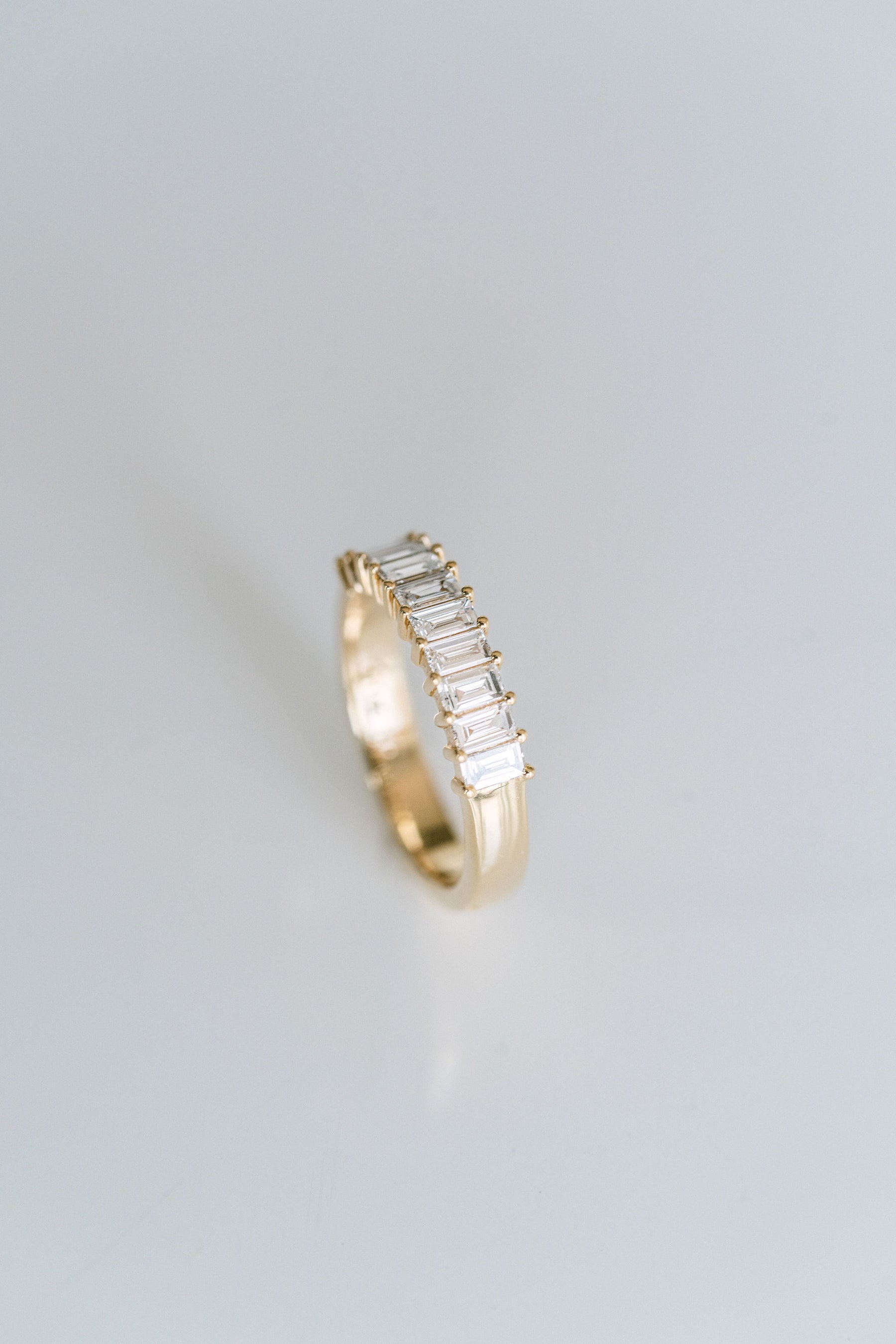 10 baguette cut Diamonds in a clean and classic setting. A balanced, symmetrical piece to add to your stack as an everyday piece or beautiful wedding band.