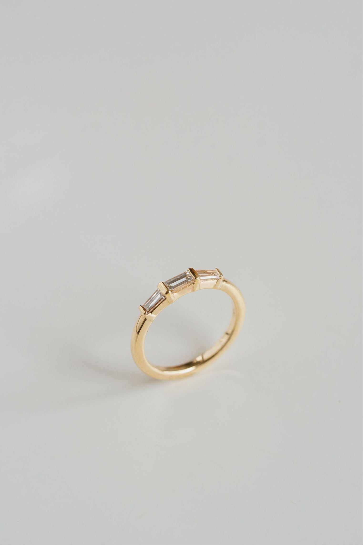 Three baguette Diamonds— one straight, two tapered. Slim in profile but bold in sparkle, perfect for an everyday stacking piece or subtle wedding band look.