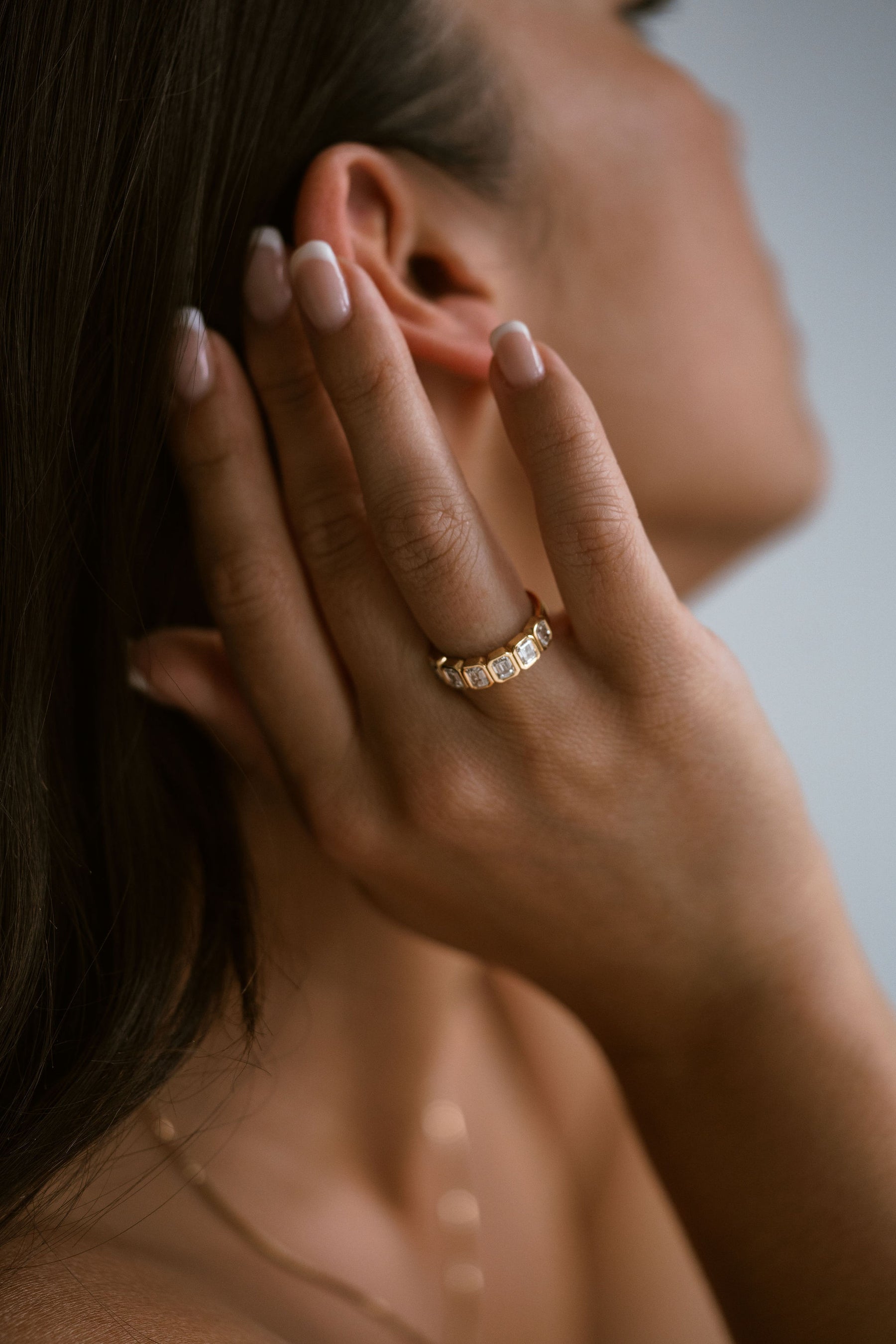 A 6-stone emerald cut Diamond bezel band. Each stone wrapped in gold to highlight the cut, while offering additional security to suit a highly active lifestyle. Style as a gold-forward engagement band, wedding band or everyday accessory piece.