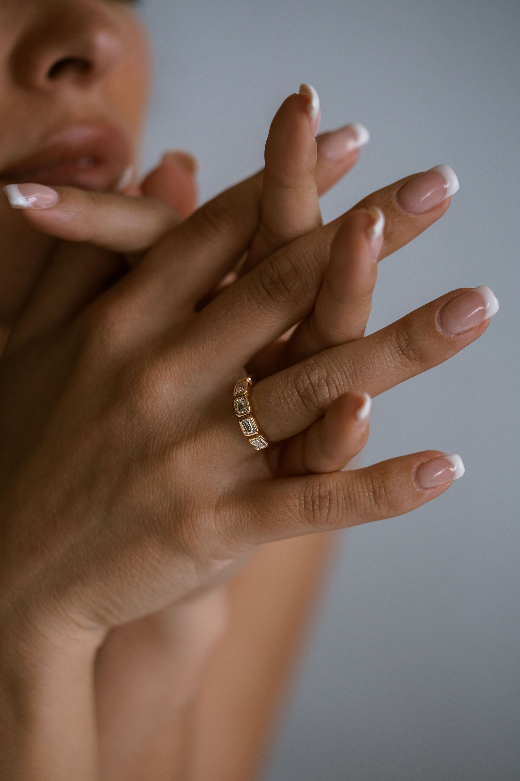 A 5-stone emerald cut Diamond bezel band, each stone east-west set and wrapped in gold offering additional security to suit a highly active lifestyle. Style as a gold-forward engagement band, wedding band or everyday accessory piece.