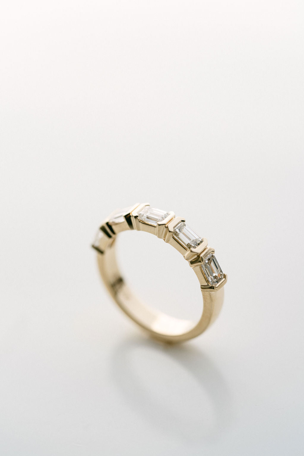 A 5-stone emerald cut Diamond band, each stone set east-west in our signature half bezel. Wear this piece as a gold-forward Diamond engagement band, wedding band or stacking accessory piece.