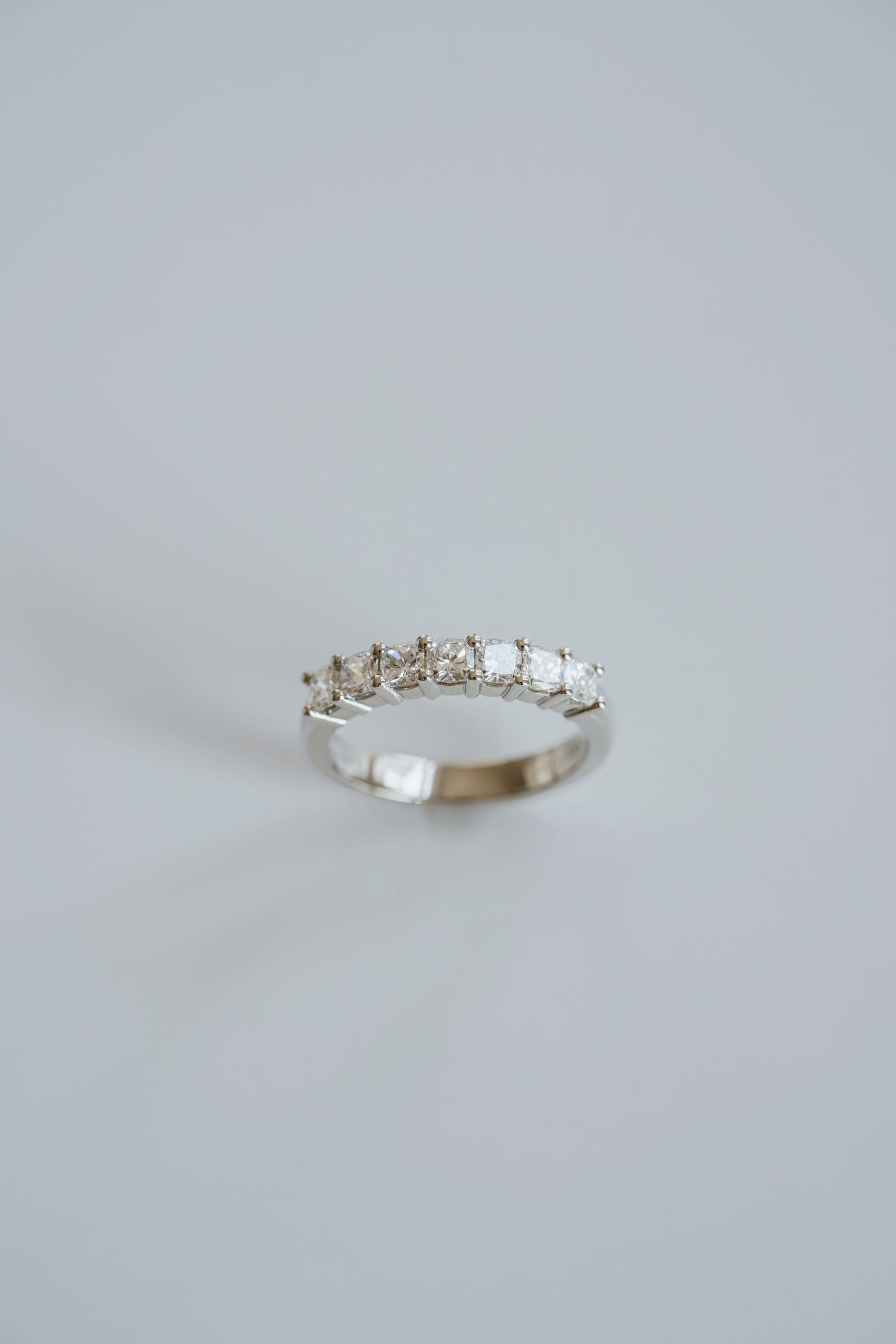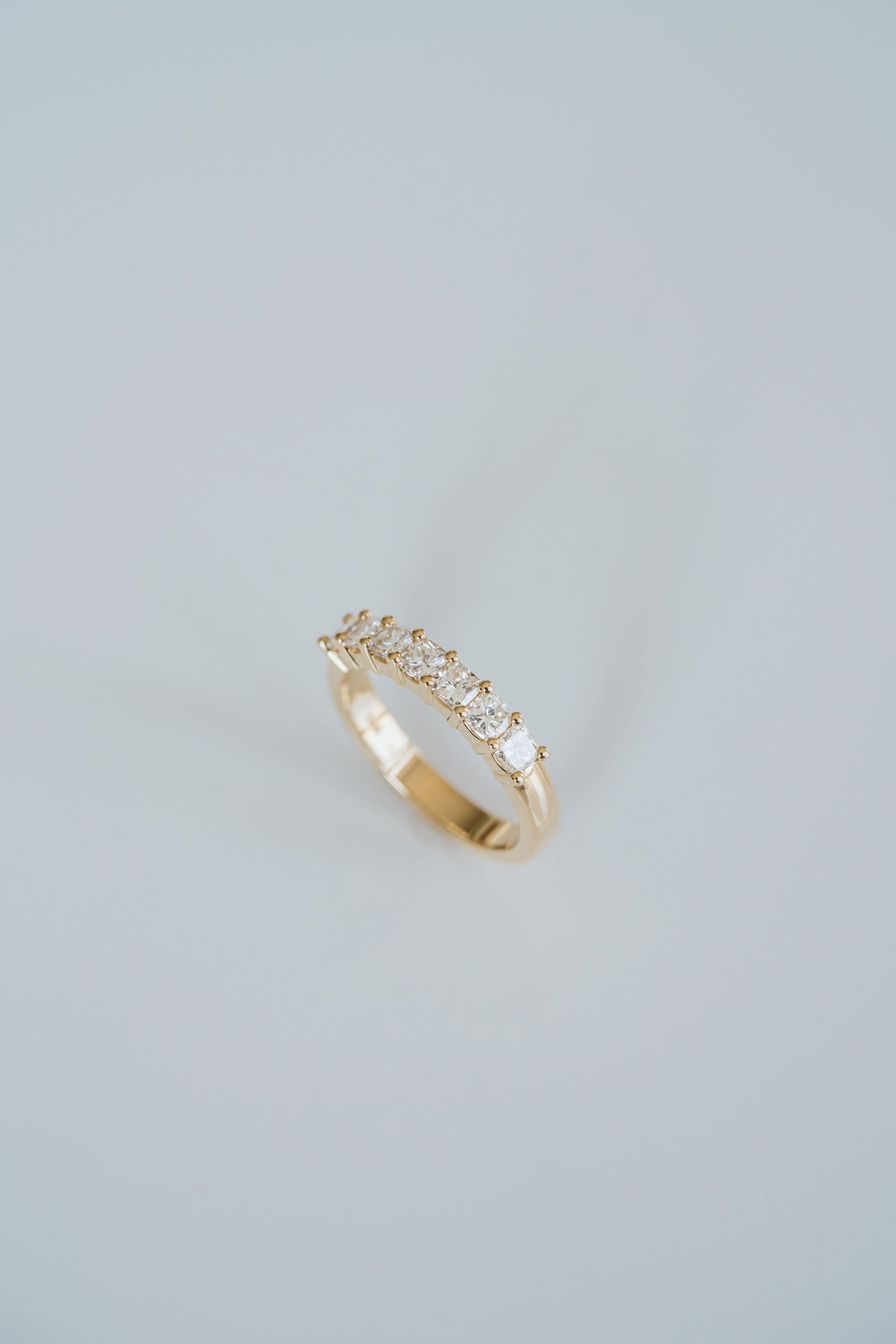 A modern interpretation of a classic diamond band, featuring a row of softly squared cushion-cut diamonds, each hand-set to highlight its unique brilliance and shape. The result is a design that feels both structured and refined, a timeless statement whether worn alone or paired within a stack.