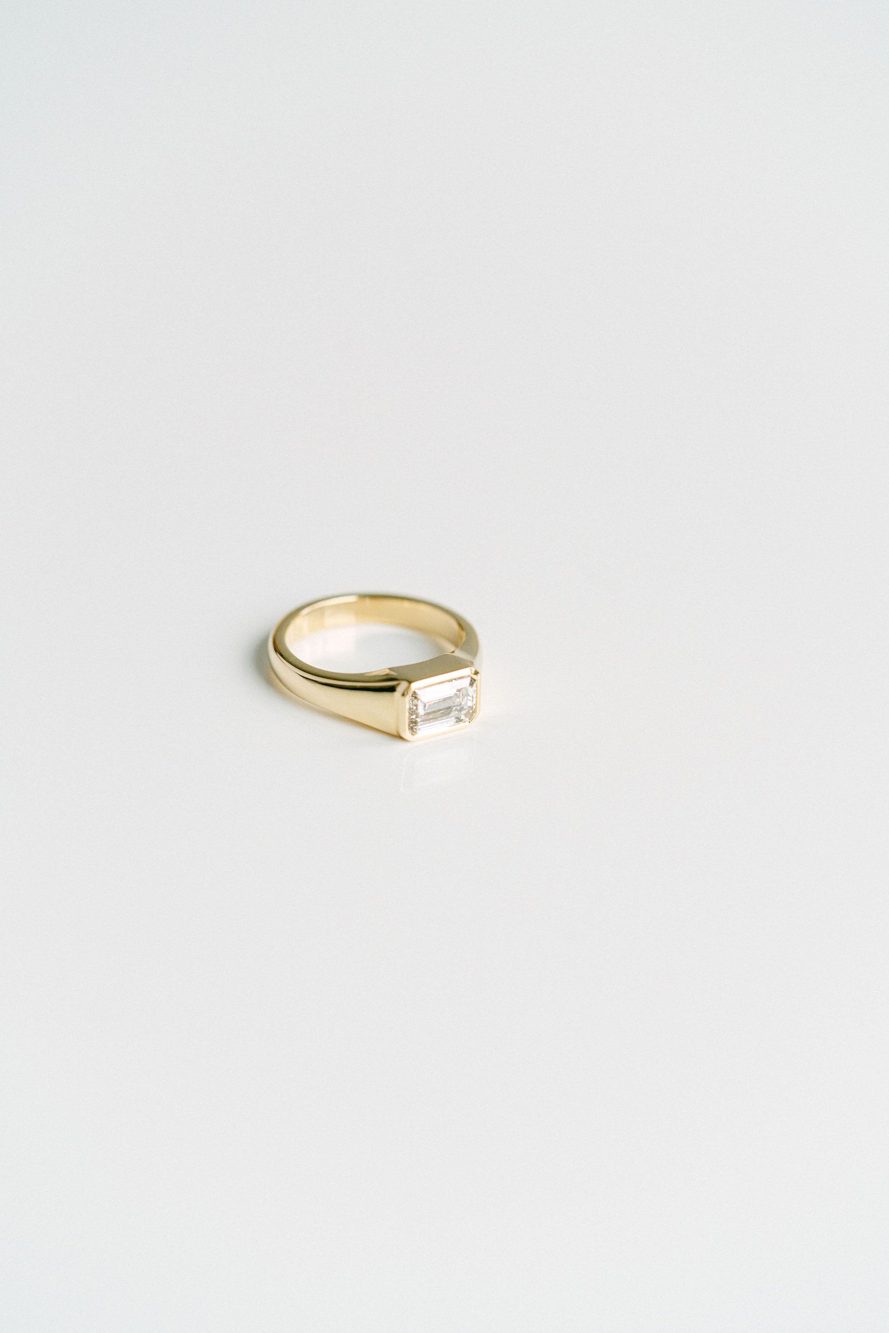 A sleek signet ring with an east-west set emerald cut Diamond. Designed for the gold-forward eye with angular and thoughtful curves hugging the centre stone. Style as an everyday accessory ring or unique engagement ring.