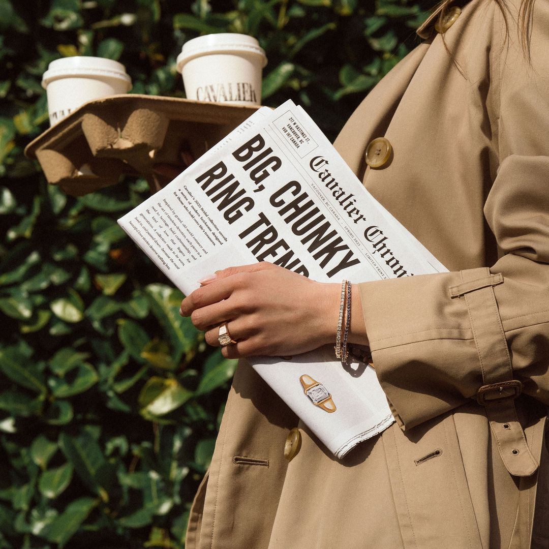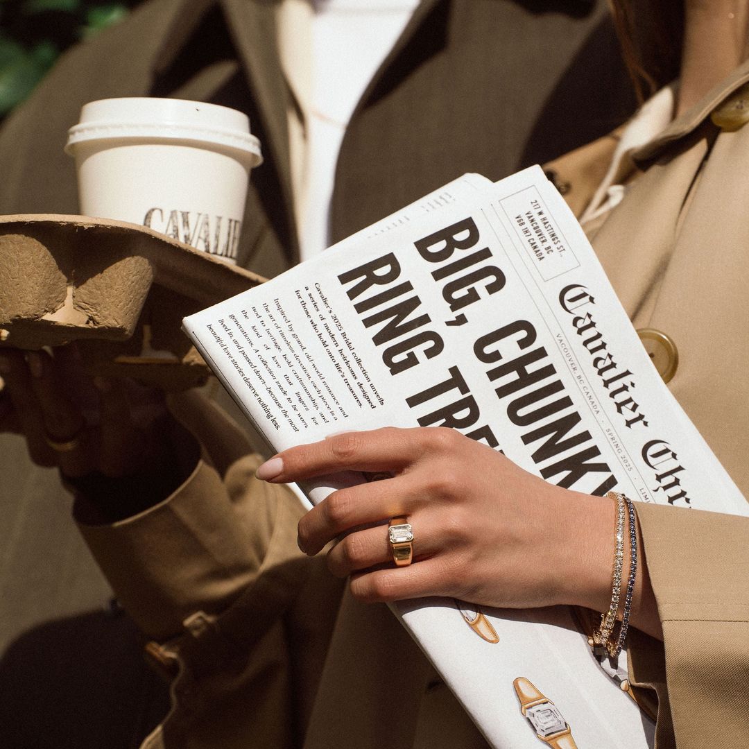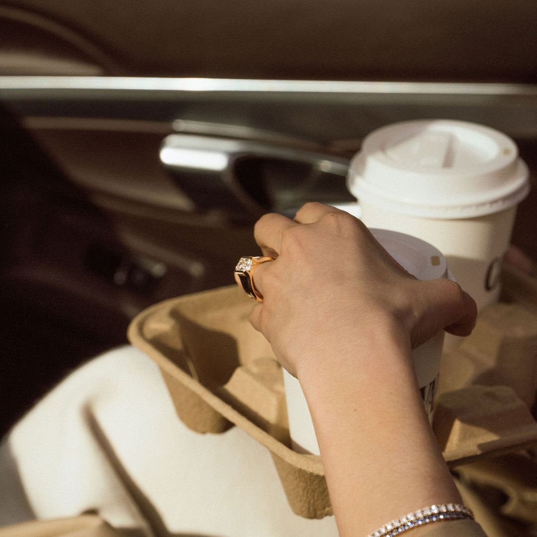 This emerald cut Diamond takes centre stage in this gem-forward, top-heavy signet design— where bold meets refined. The open setting detail keeps things airy in the boxy silhouette of this powerful piece. Style as a chunky engagement ring or bossy cocktail ring.