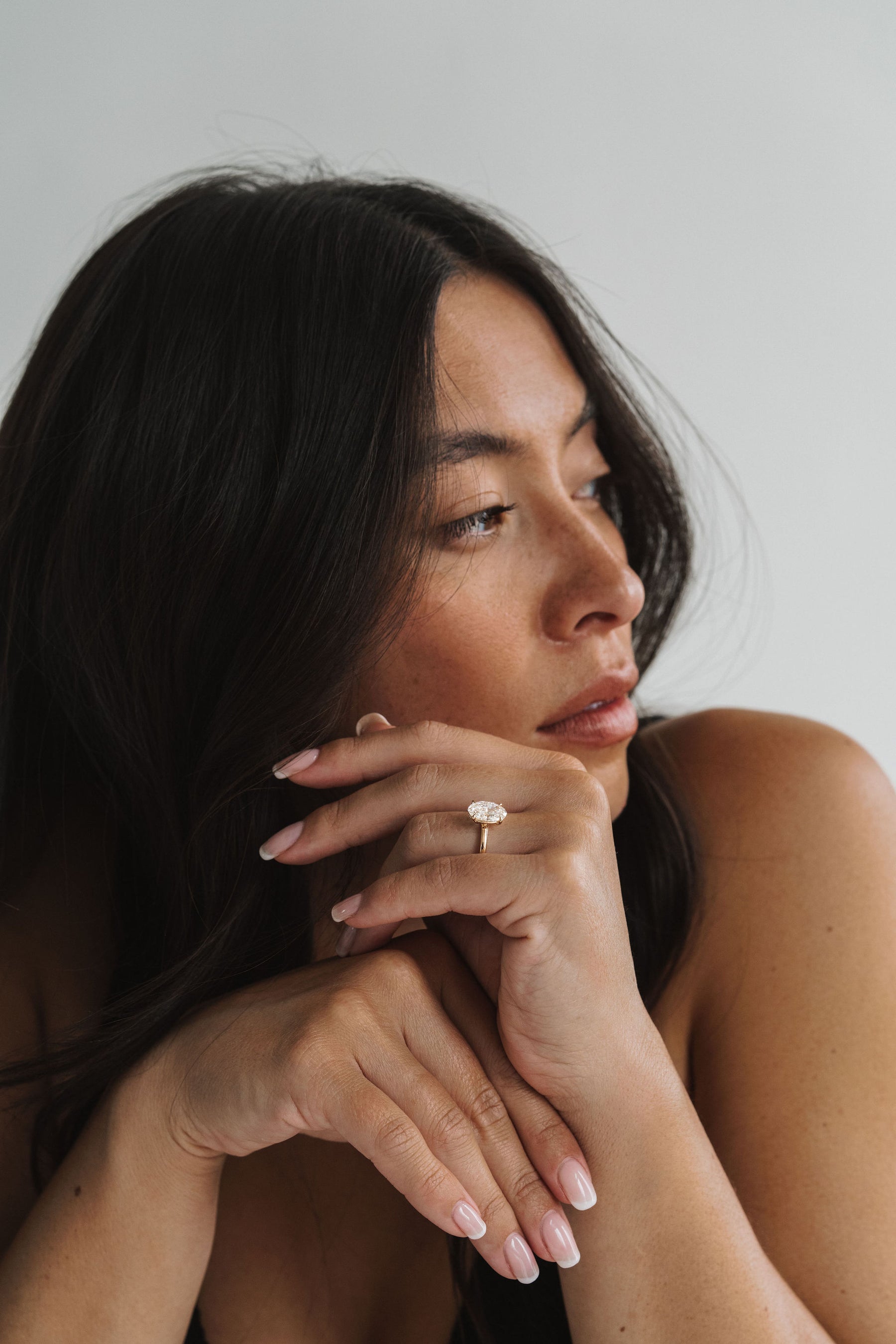 An oval Diamond solitaire, classic and timeless with a subtle, elegant profile. A solitaire setting refers to a ring style with just one centre stone, allowing the star of this piece to shine in it's simplicity. This solitaire style is medium set which is designed for the stone to still sit above the finger, but in a lower, more subtle profile.Â