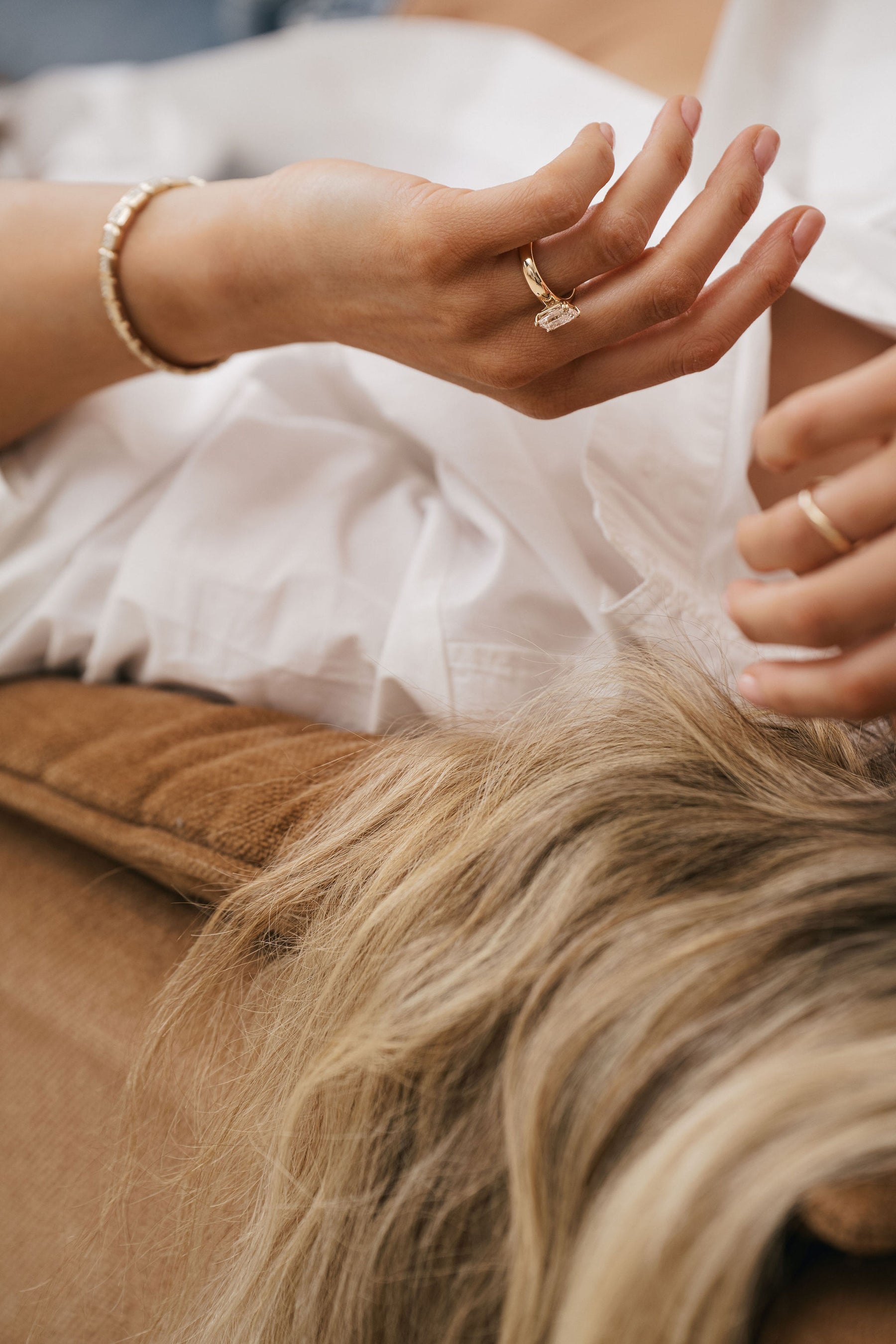 Radiant cut Diamond on a heavy, rounded, solid gold band with a double prong detail. Style as an engagement ring or just a smokin' Diamond ring in your rotation.