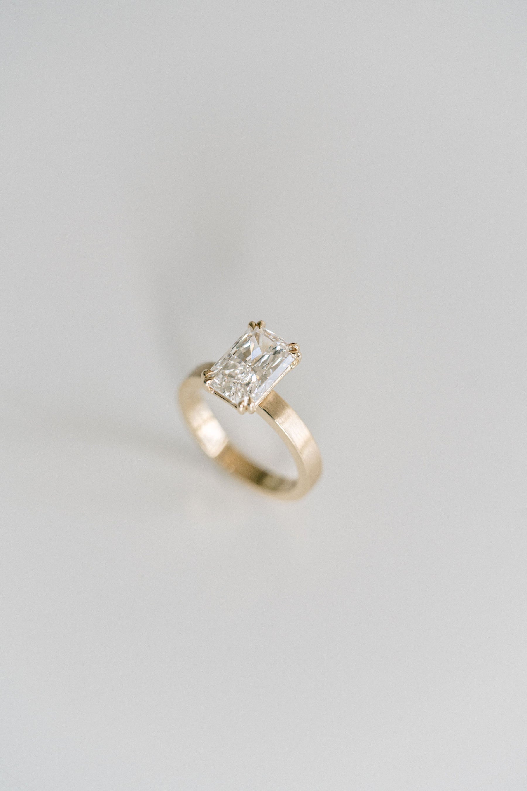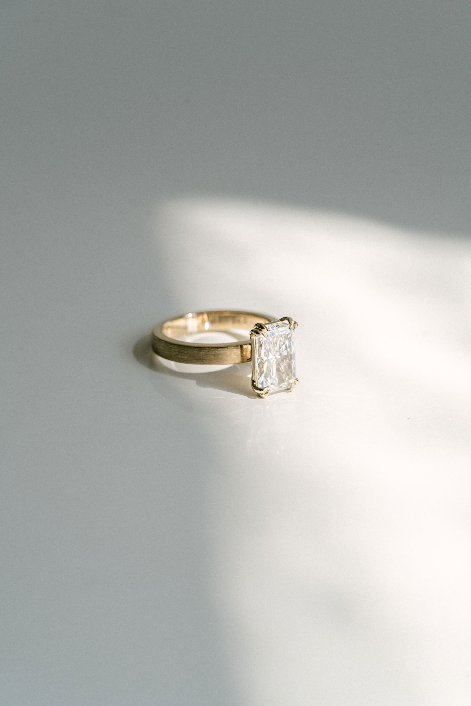Radiant cut Diamond solitaire on a flat, wide brushed band with a double prong detail. Soft and subtle details to spice up a traditional engagement ring style.