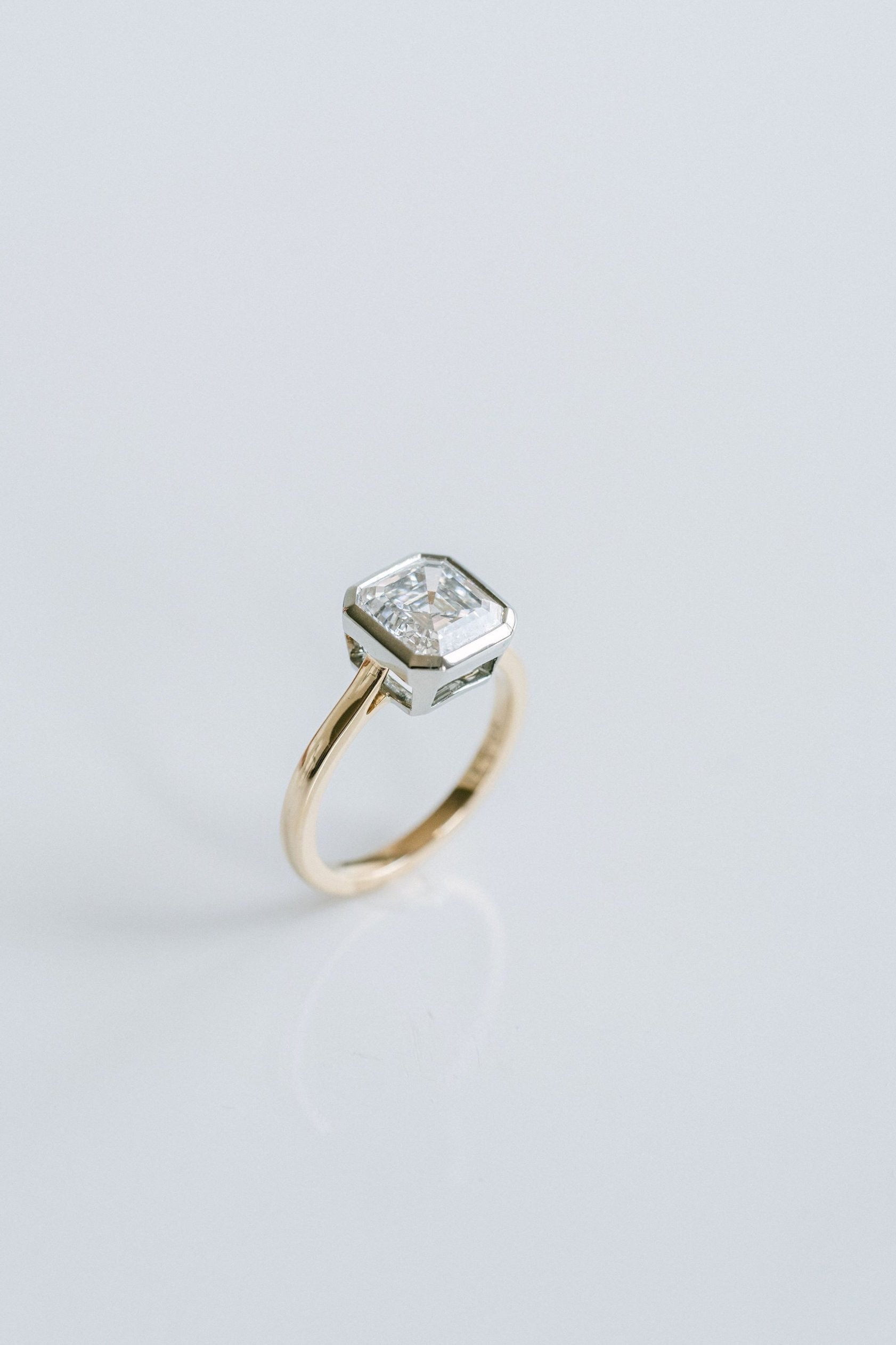 A square emerald cut Diamond in our two-tone breeze bezel ring design. An open-concept bezel, still achieving that sought after gold-frame look while offering light to enter the stone from both the sides and bottom of the basket. Style as an engagement ring or cocktail piece.