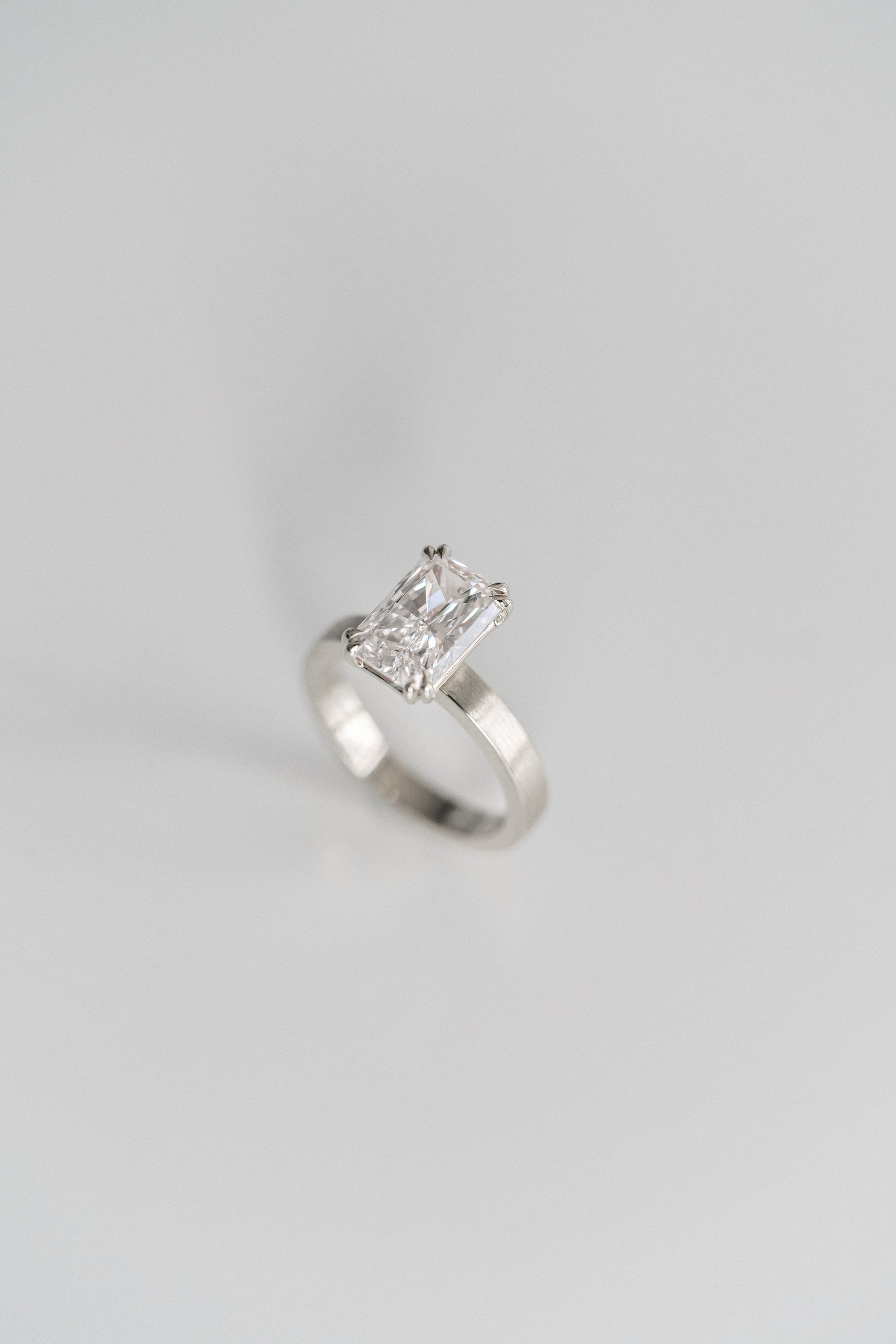 Radiant cut Diamond solitaire on a flat, wide brushed band with a double prong detail. Soft and subtle details to spice up a traditional engagement ring style.