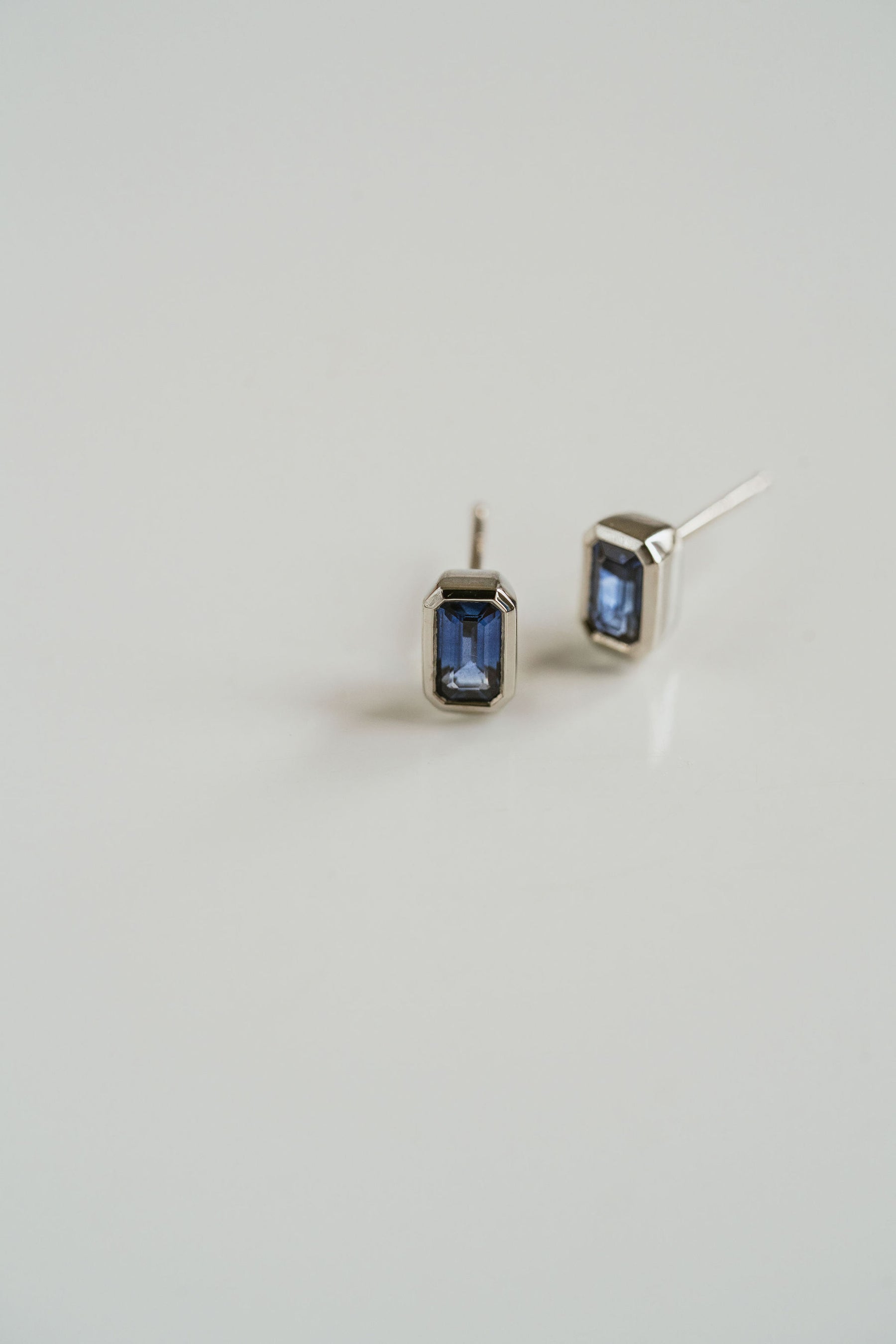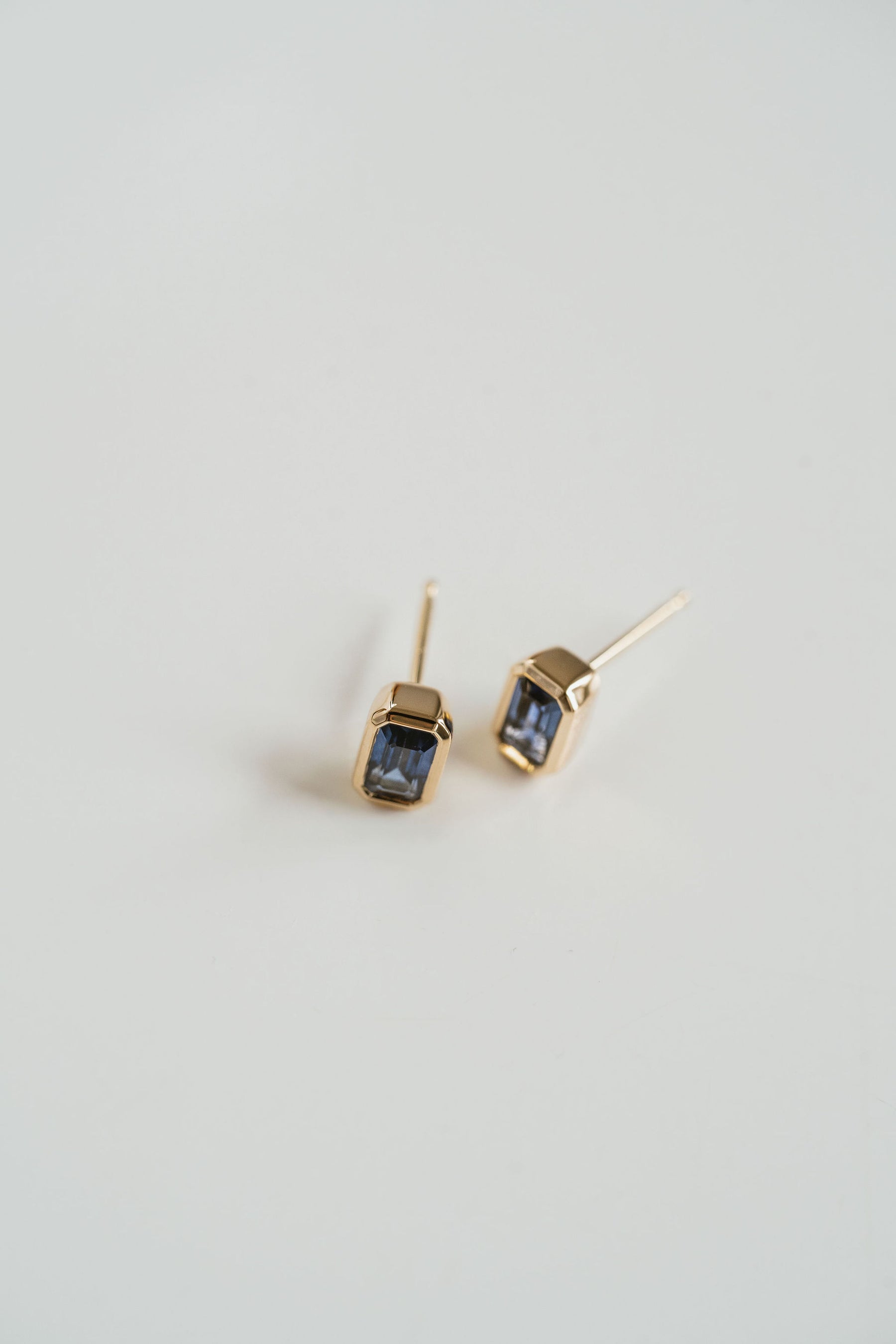 Emerald cut blue Sri Lankan Sapphire studs in a wrap-around bezel setting. A sharp, clean and gold forward look to add into your everyday rotation.