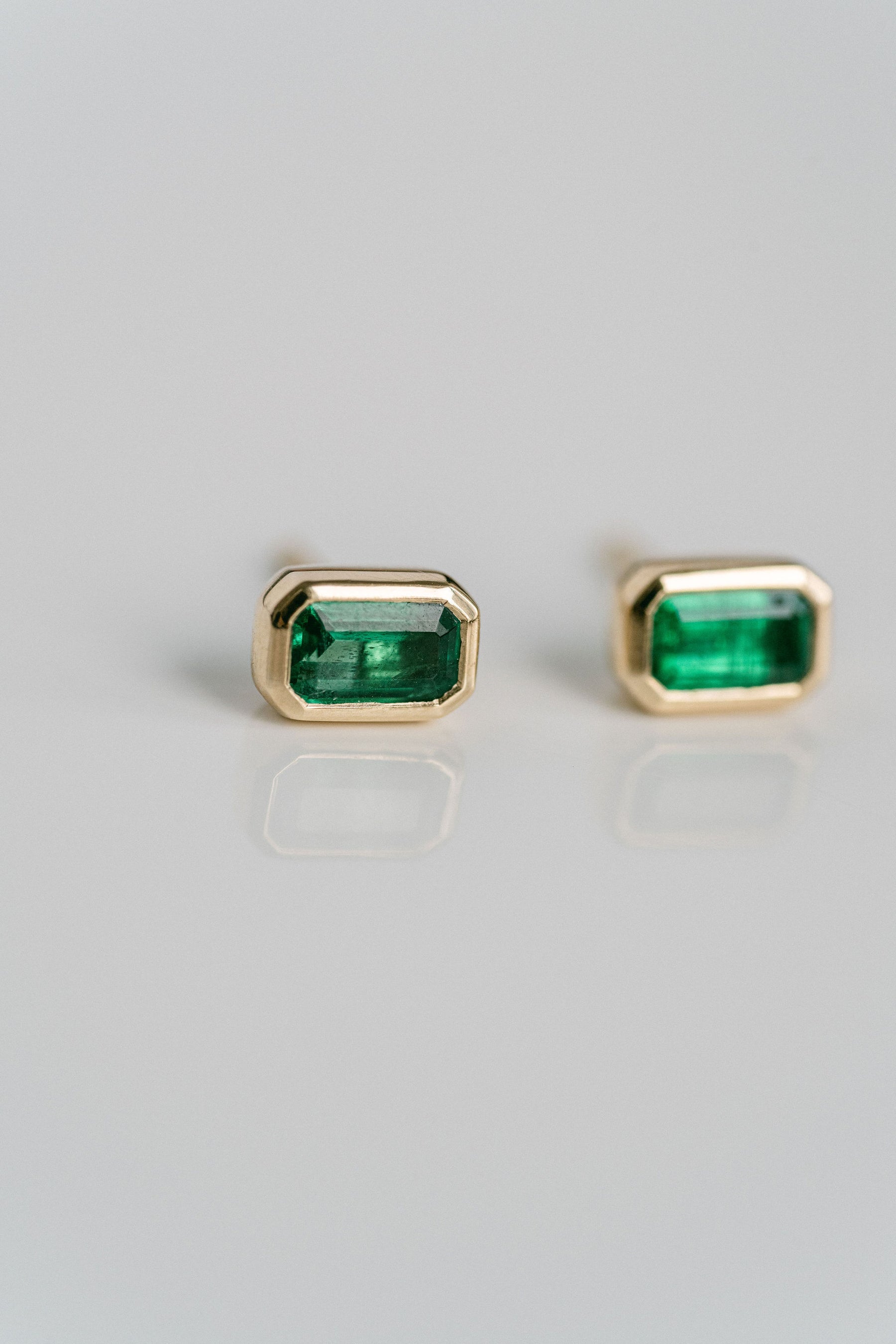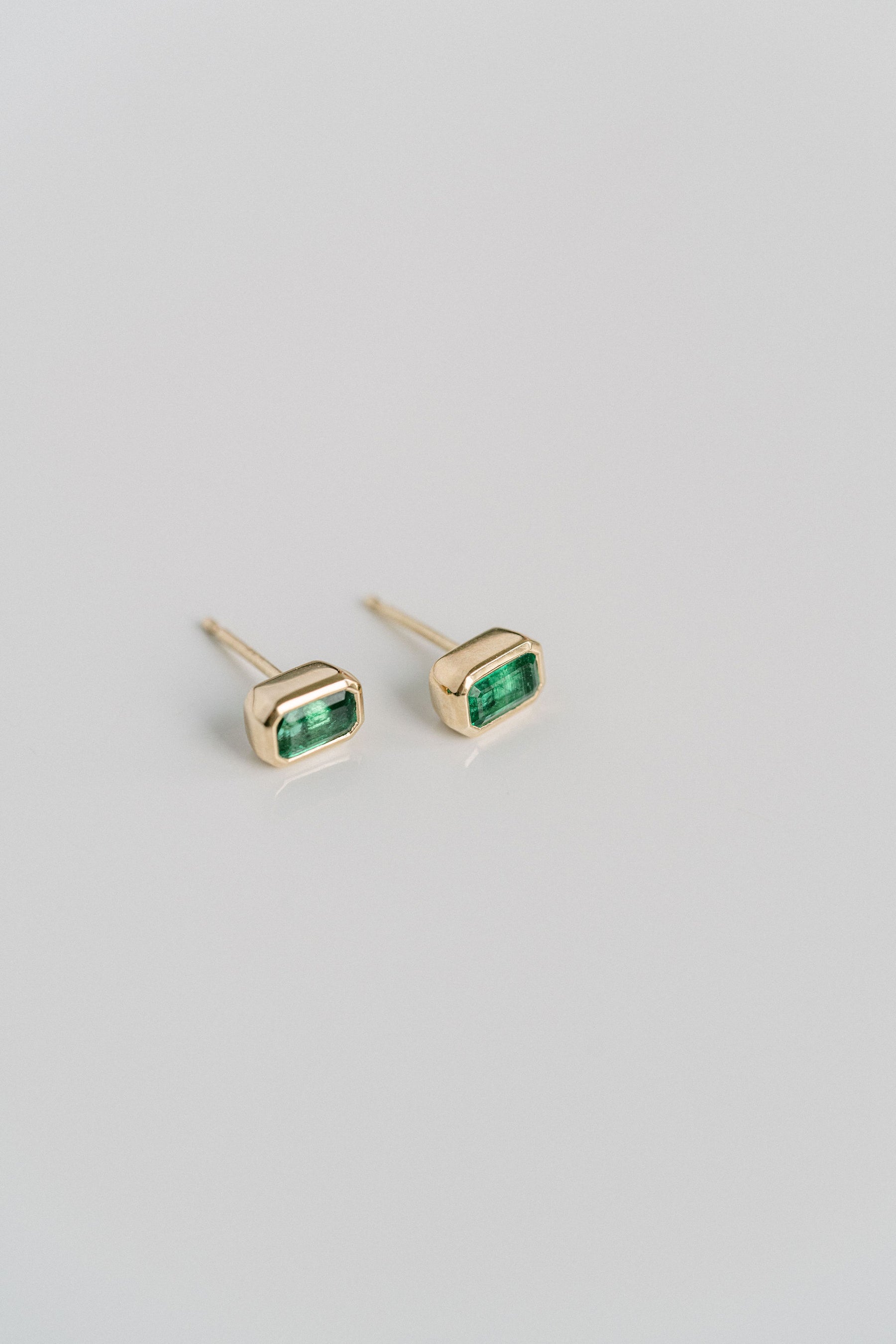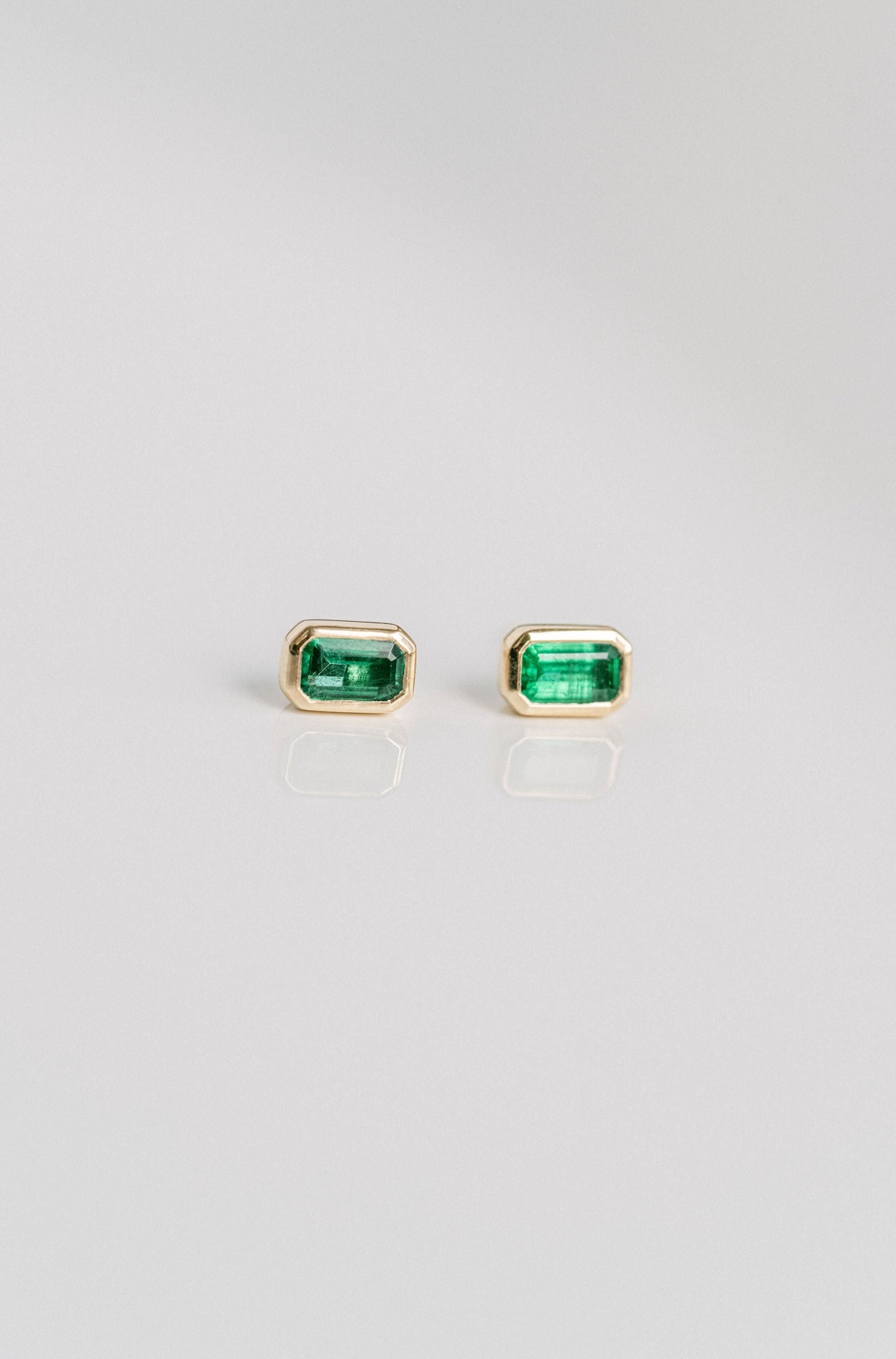 A pair of emerald cut Colombian Emerald studs in a bezel setting. Something for the gold-forward, pop of color kind.