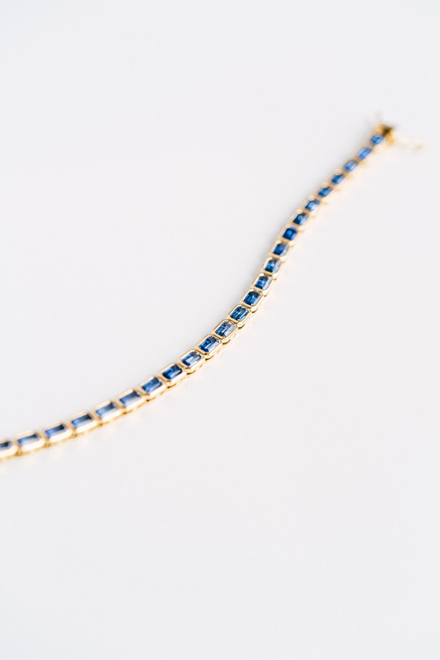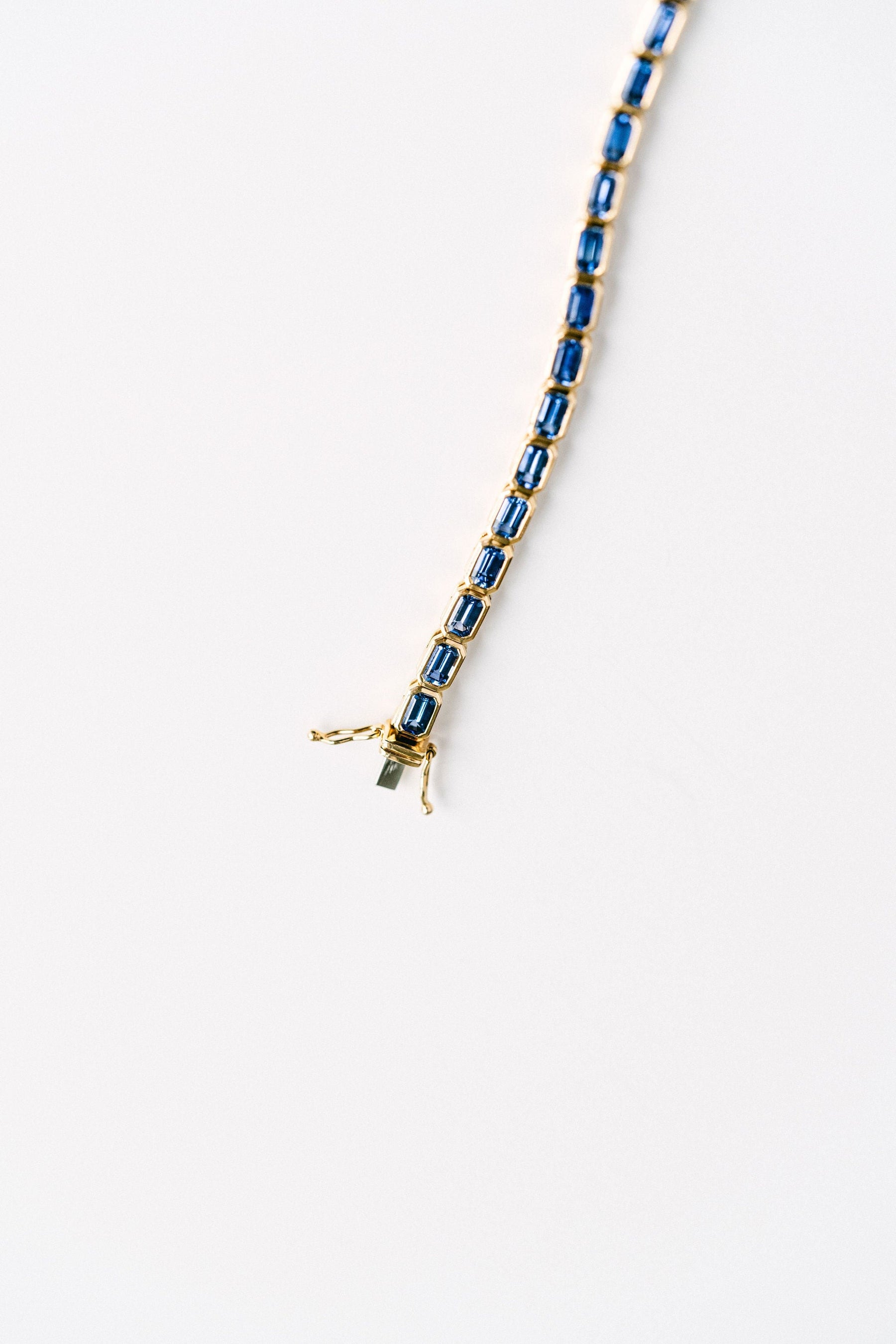 Wrap your wrist with this gorgeous emerald cut blue Sri Lankan Sapphire bezel tennis bracelet. Style as an everyday accessory or occasion piece.