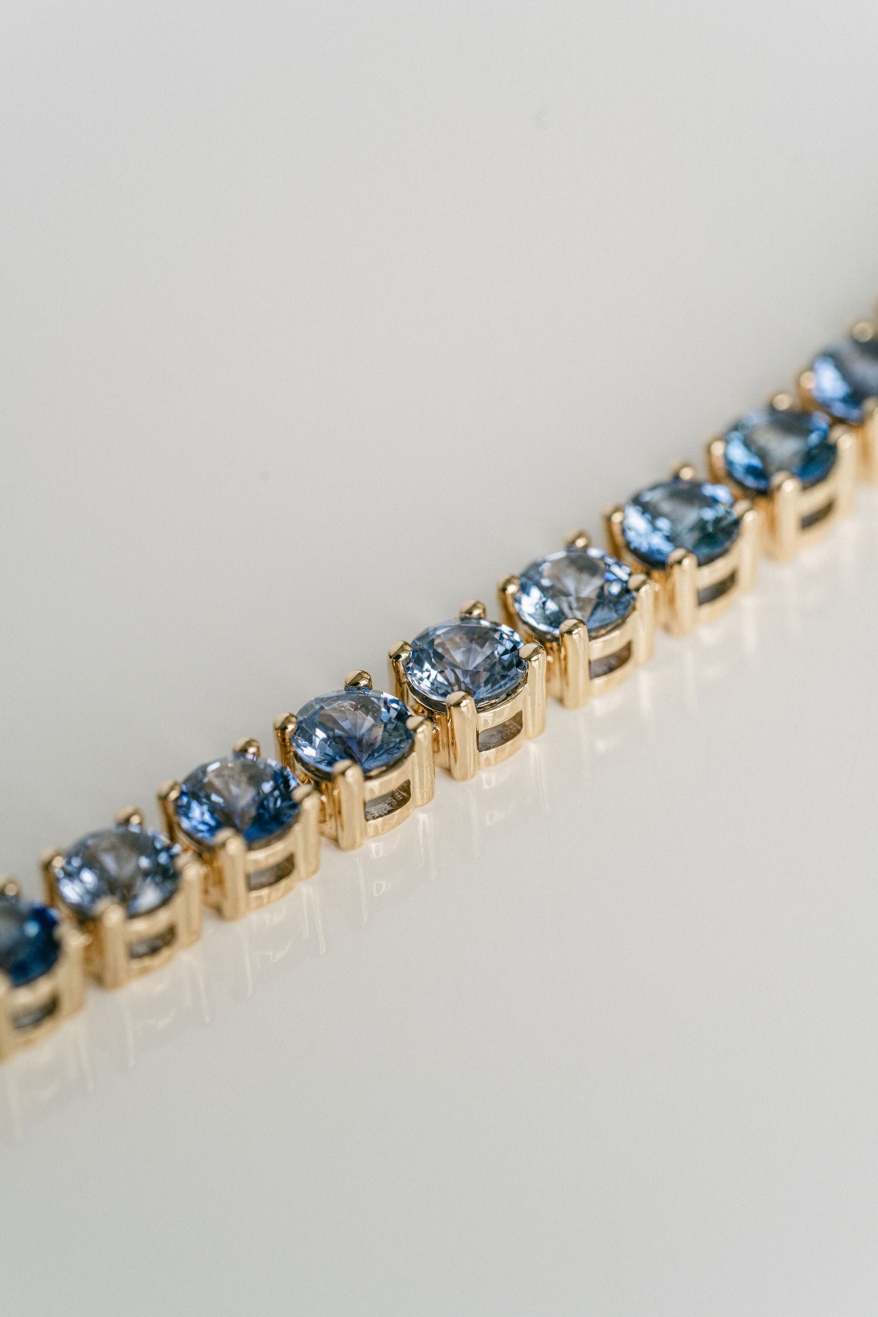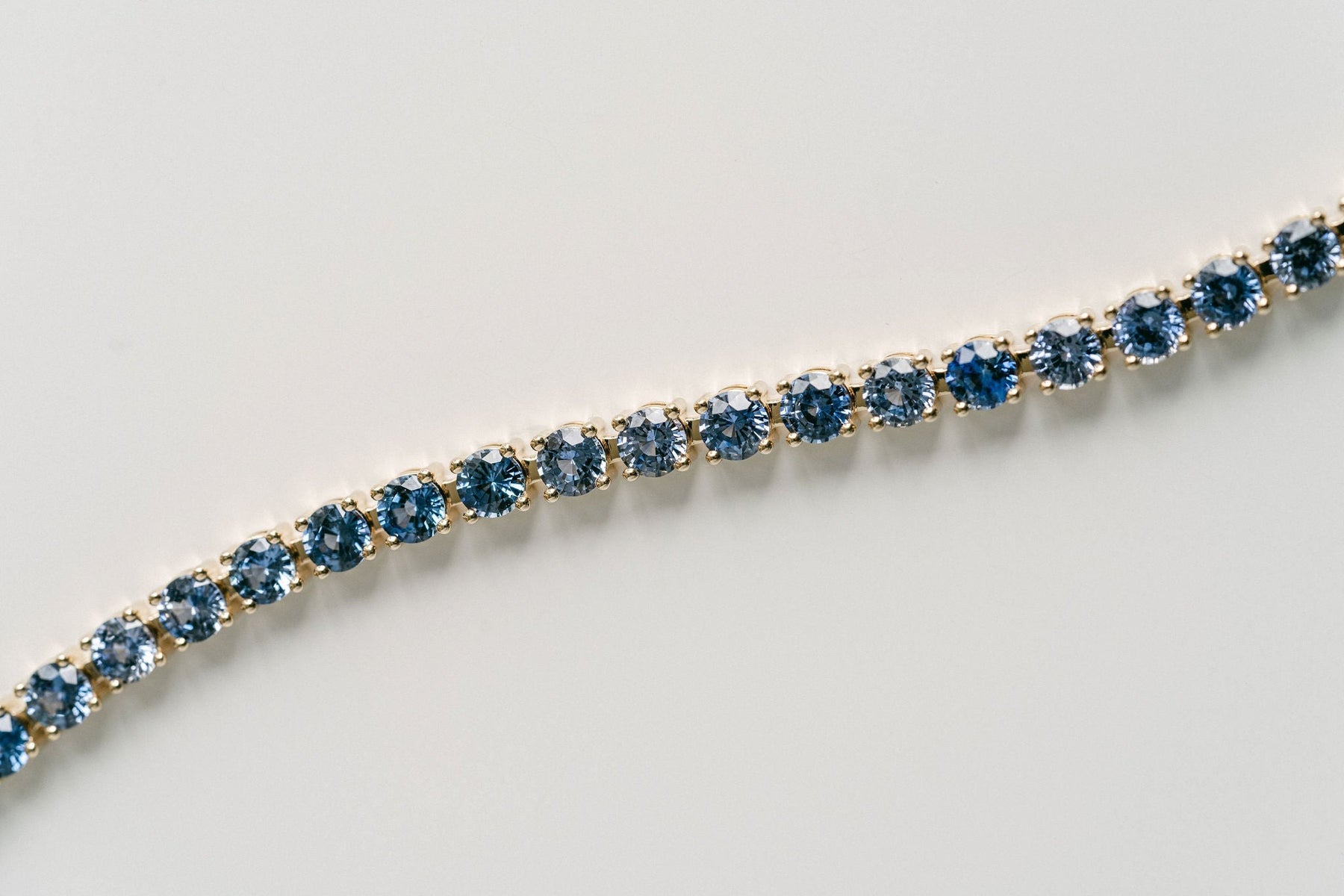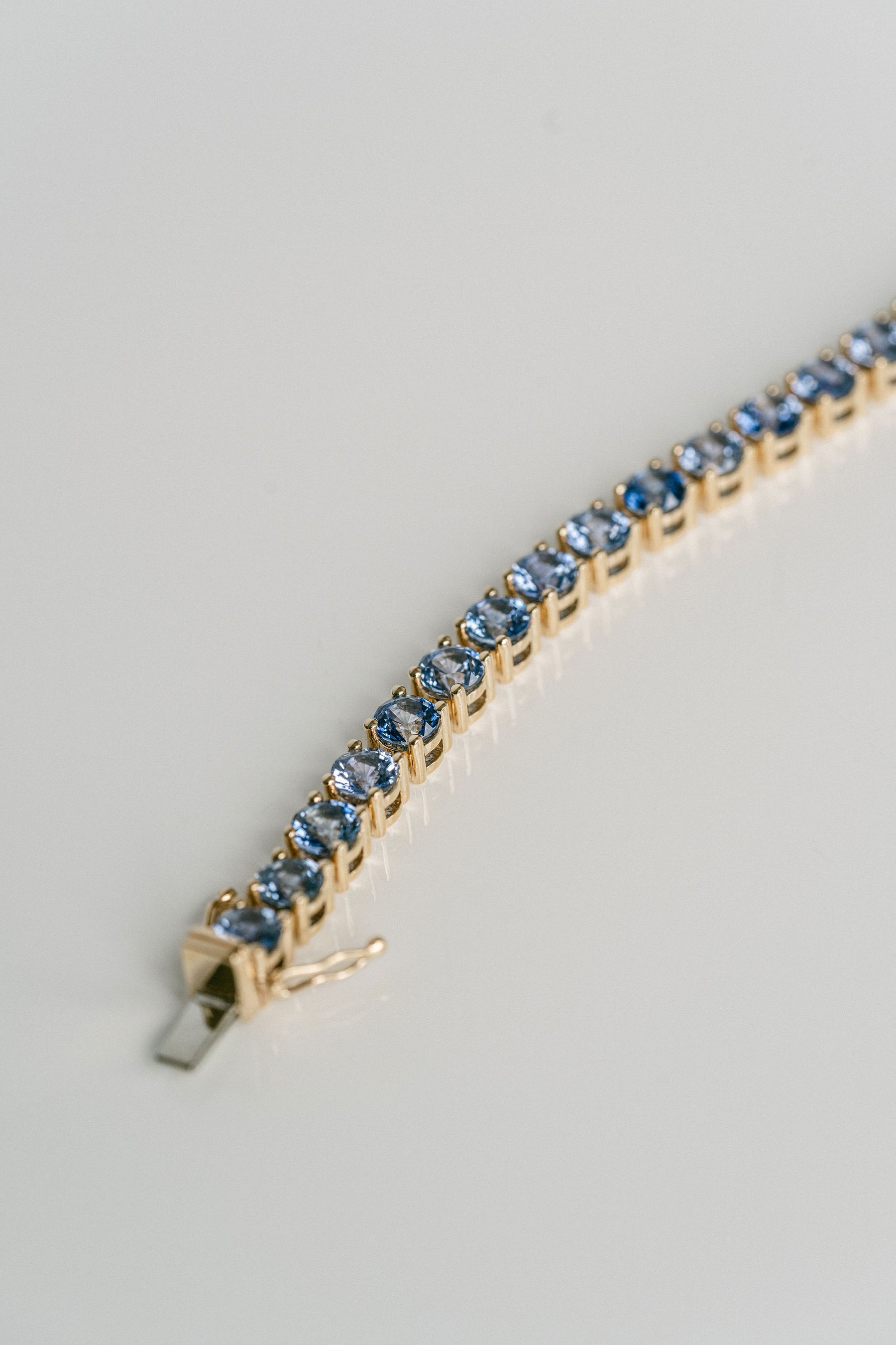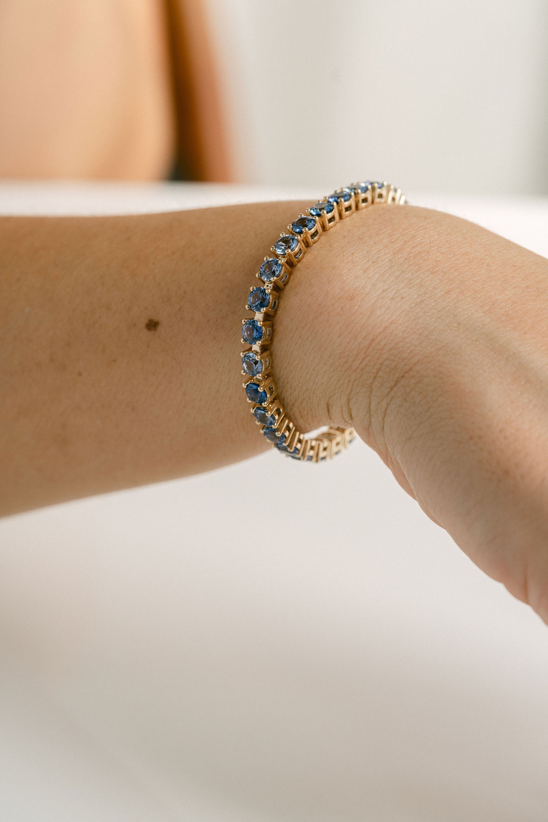 A juicy blue piece to add to your collection. This tennis bracelet is designed with round blue Sri Lankan Sapphire gems, each with a four-prong detail in a classic spaced out design for comfort and security.