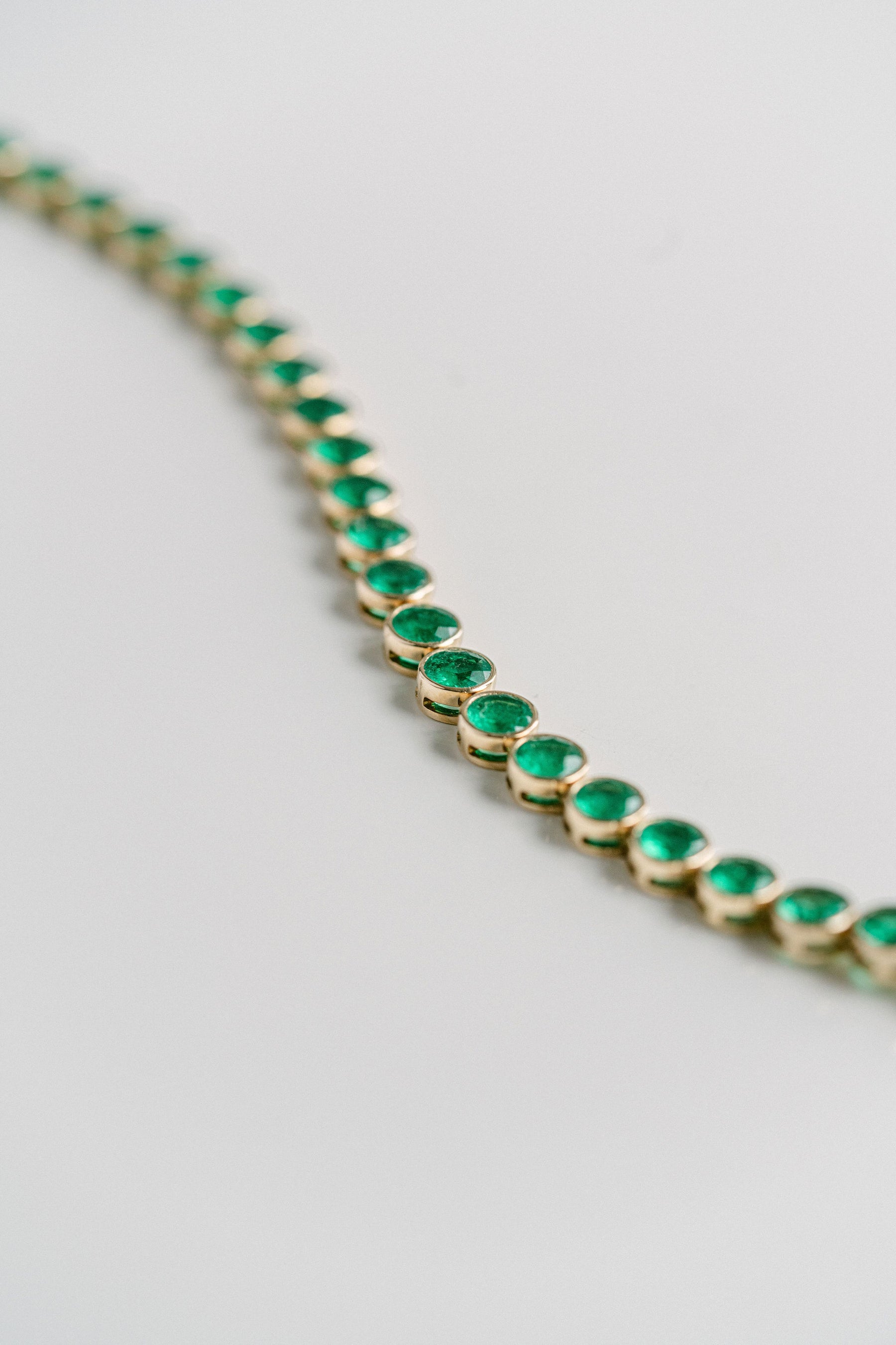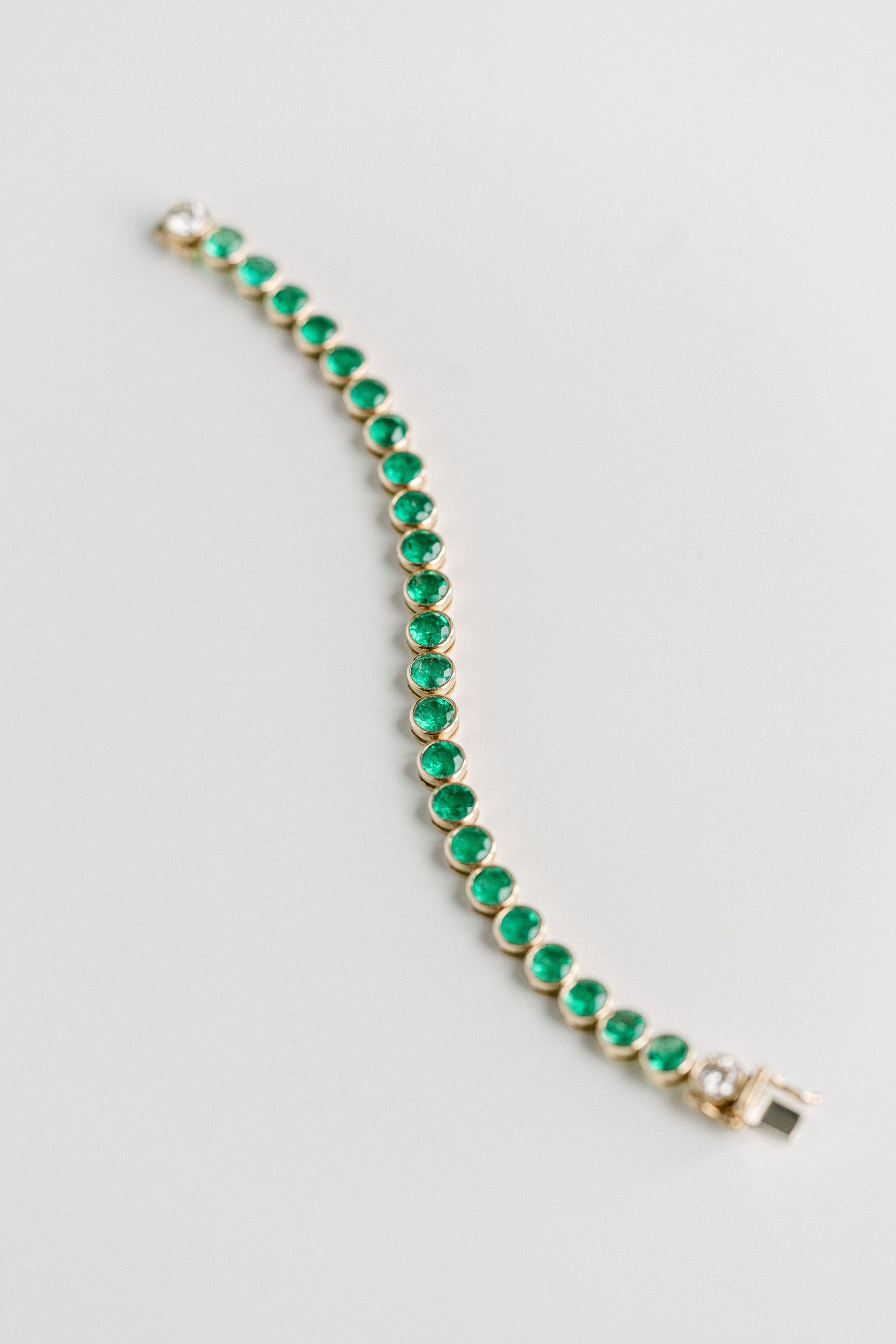 Add to your accessory collection with this juicy round Colombian Emerald bezel tennis bracelet, set with two round brilliant Diamonds meeting at the clasp. Each stone in this piece was hand-sourced to match in symmetry and colour making this piece extremely rare and truly one-of-one.