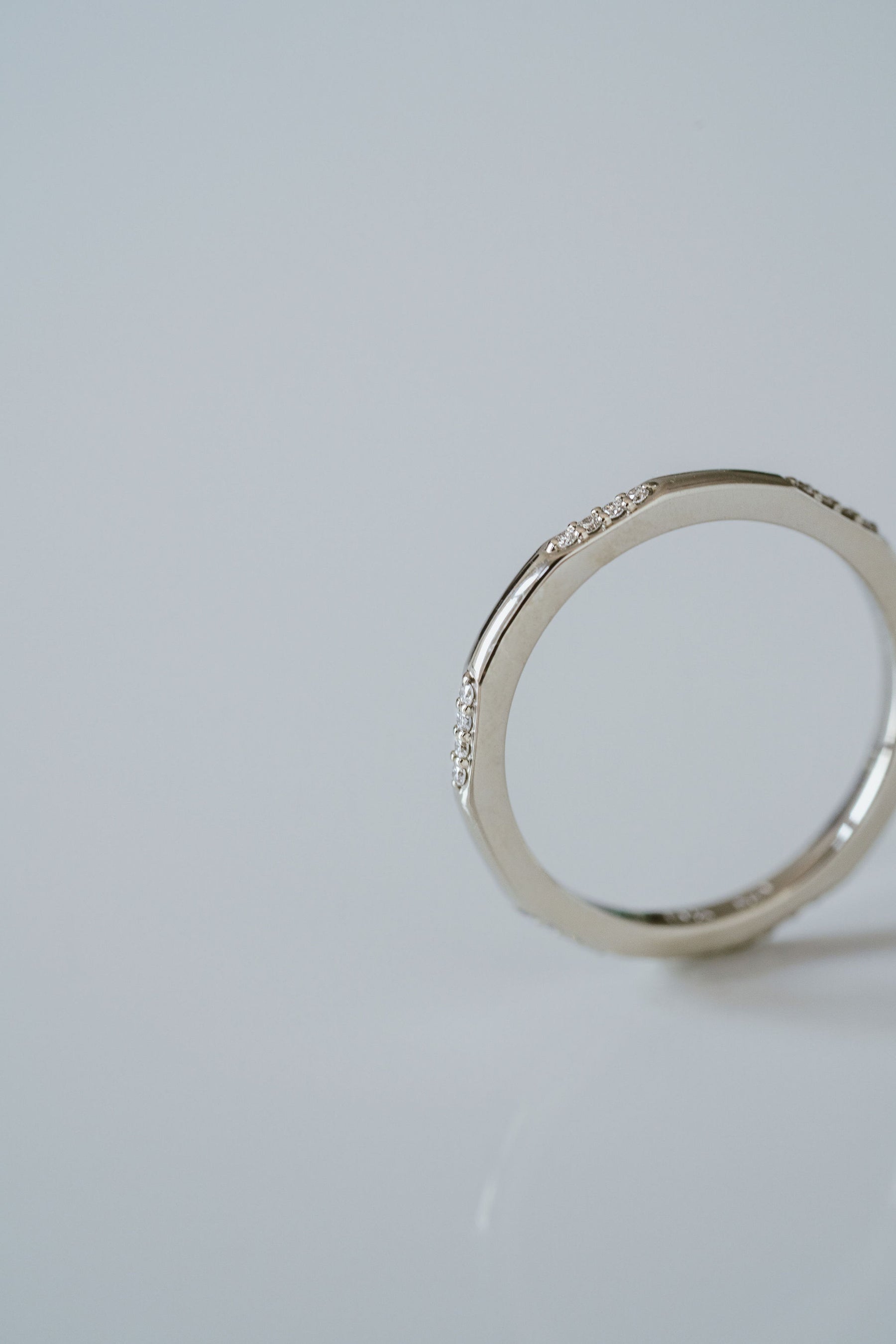 A refined take on a modern classic. The Diamond Hex Band features round brilliant cut diamonds, precision-set within a sleek gold band for subtle radiance and symmetry. Its geometric placement offers a contemporary edge while maintaining timeless elegance. Perfect as a dainty standalone piece or paired within a stack.