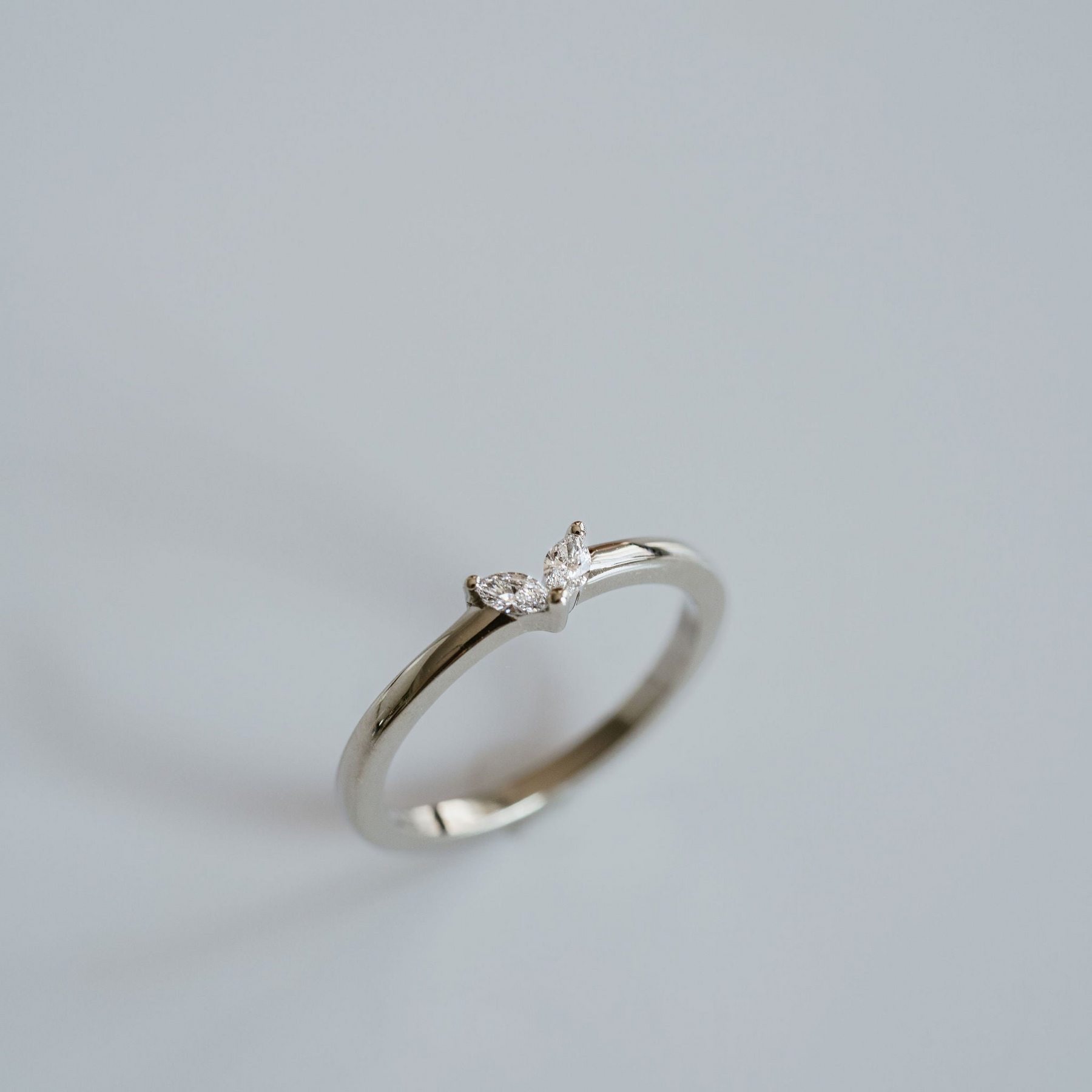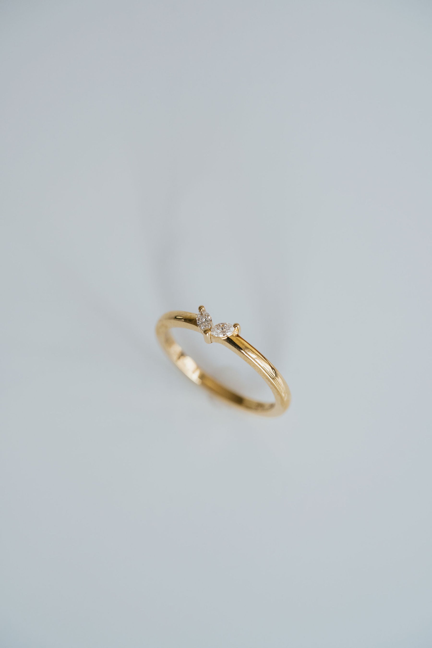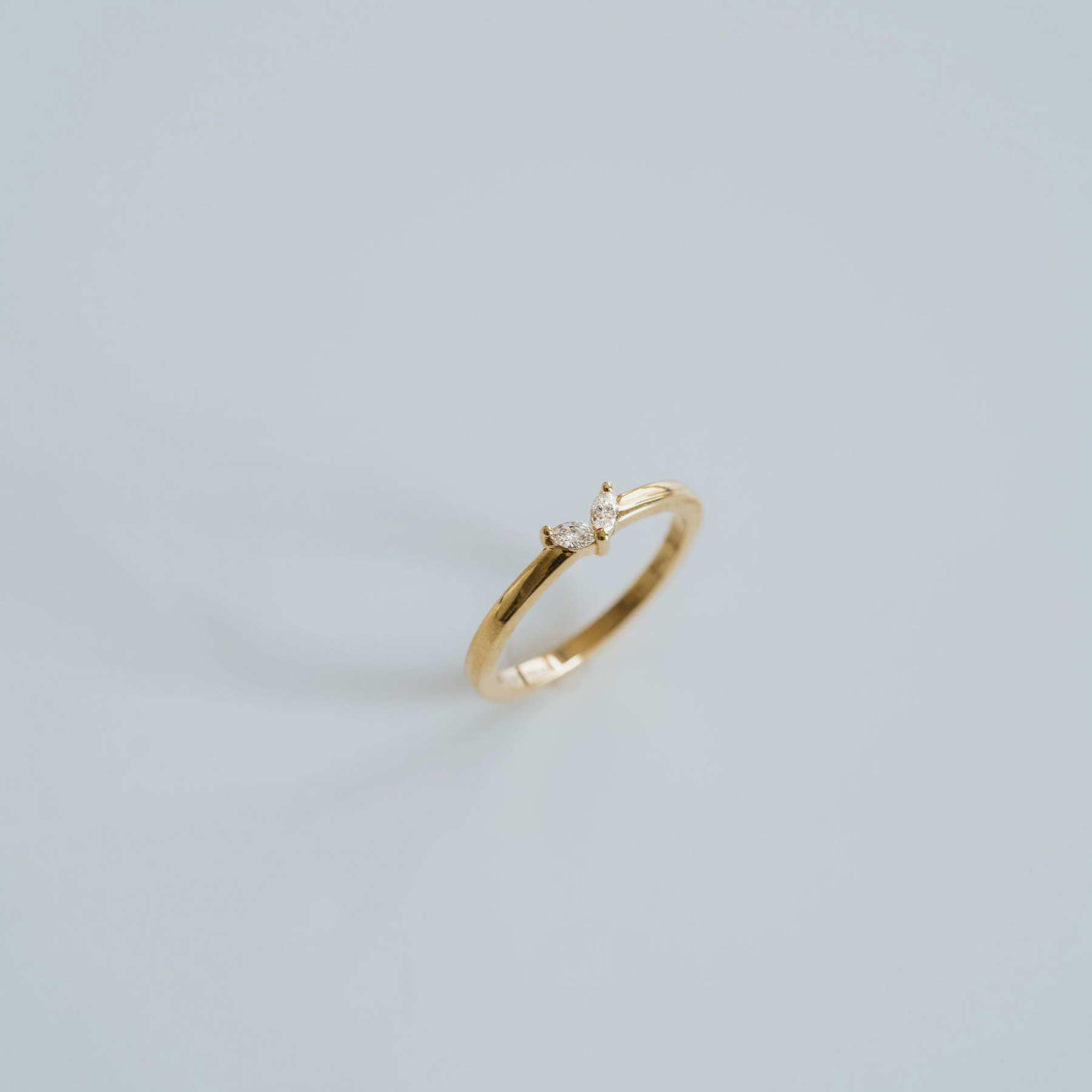 Delicate and refined, the Double Marquise Diamond Band features two marquise diamonds set in perfect balance on a polished gold band. Each diamond’s elongated shape catches the light beautifully, creating a graceful silhouette that blends modern simplicity with timeless charm. Designed for effortless stacking or elegant wear on its own.