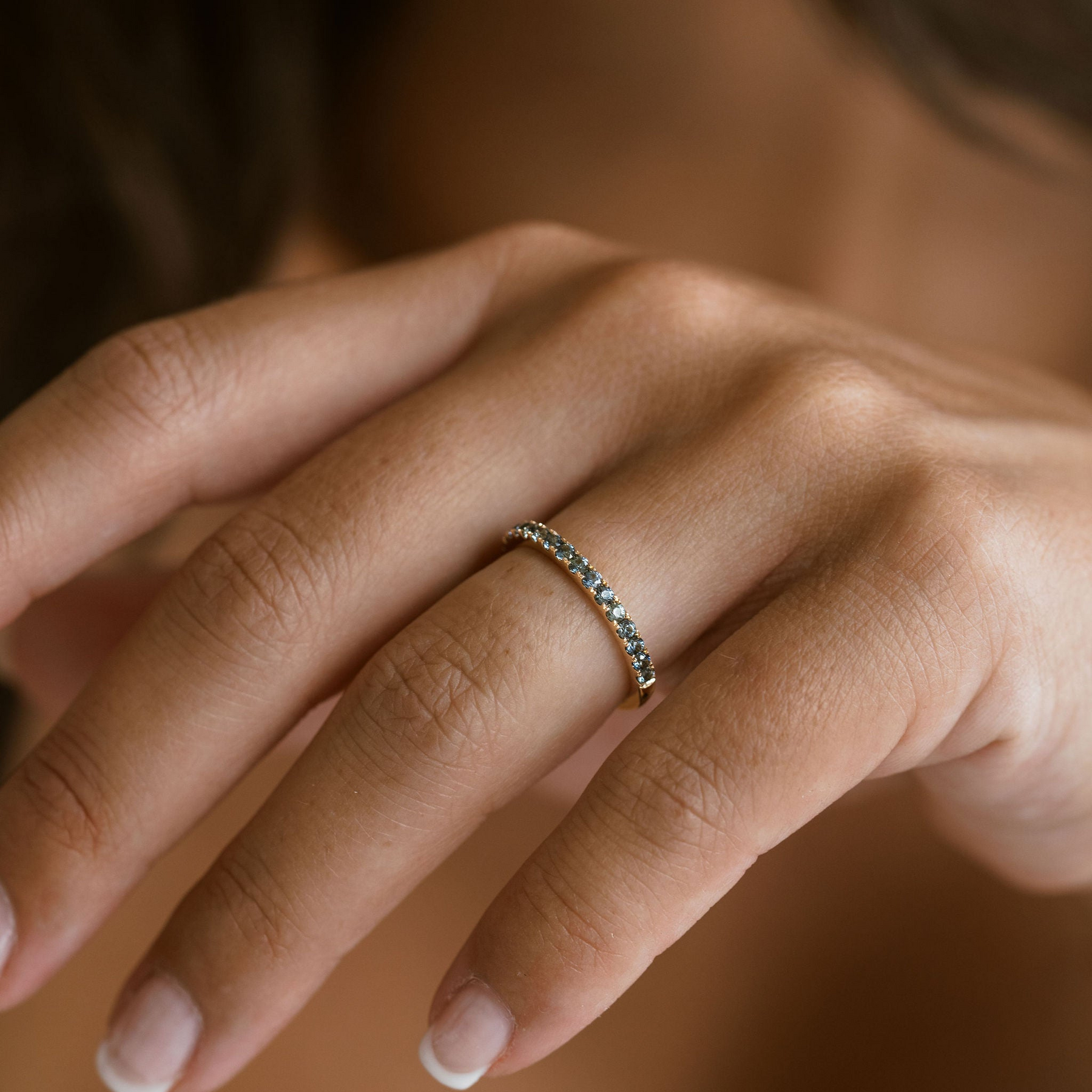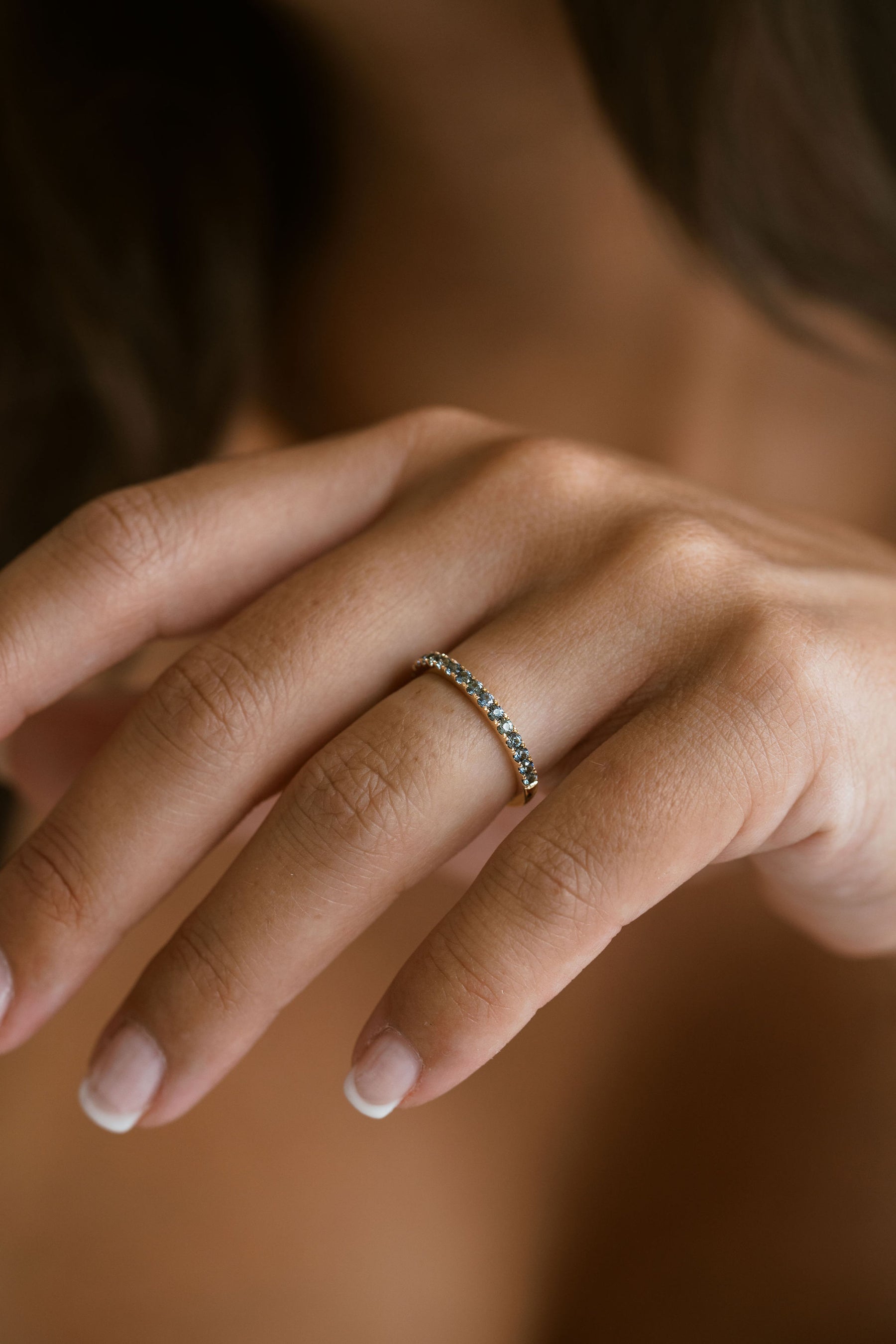 This pavè band features a row of light teal sapphires, chosen for their distinct seafoam hue and soft brilliance. Subtle and versatile, it brings a hint of colour that layers beautifully or stands effortlessly on its own.
