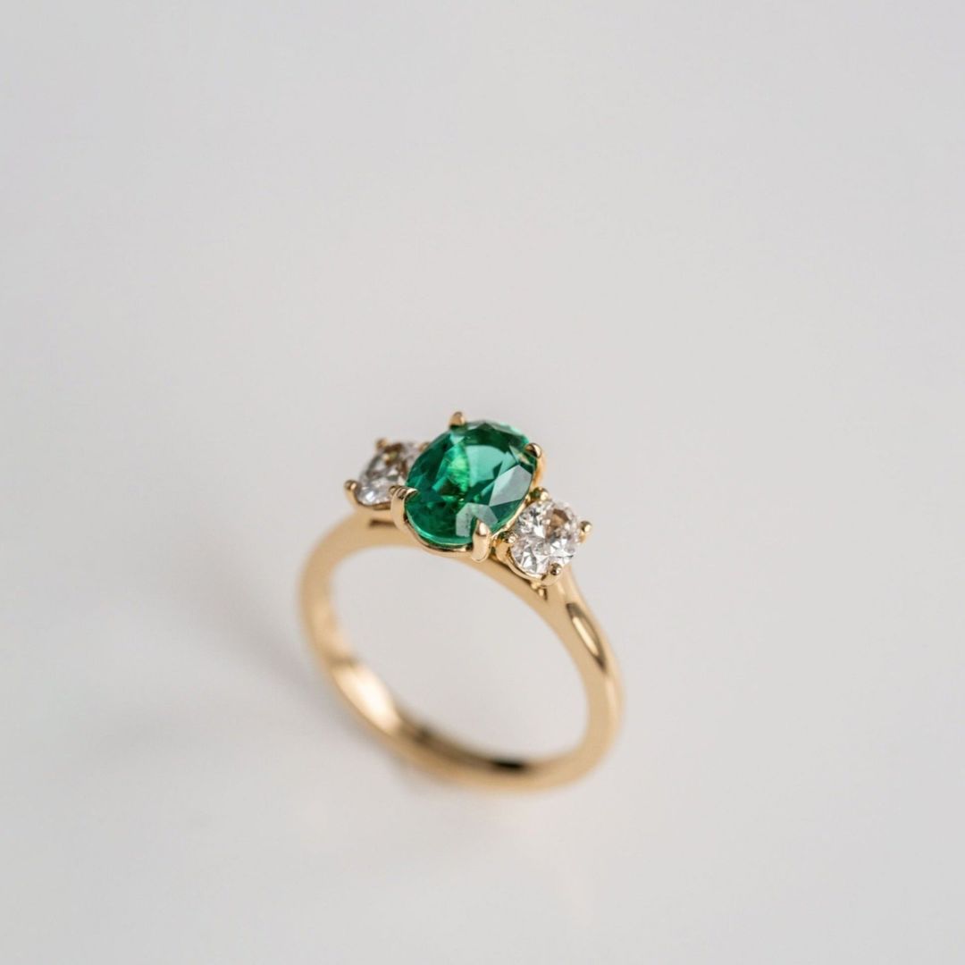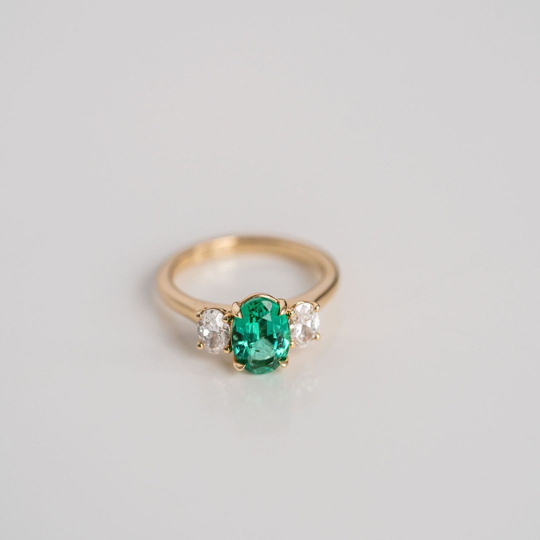 Striking in it's vivid and traditional Emerald green colour, this 3-stone Zambian Emerald is paired perfectly with two juicy oval Diamond accent stones. Style as a right hand ring or eye-catching engagement ring.