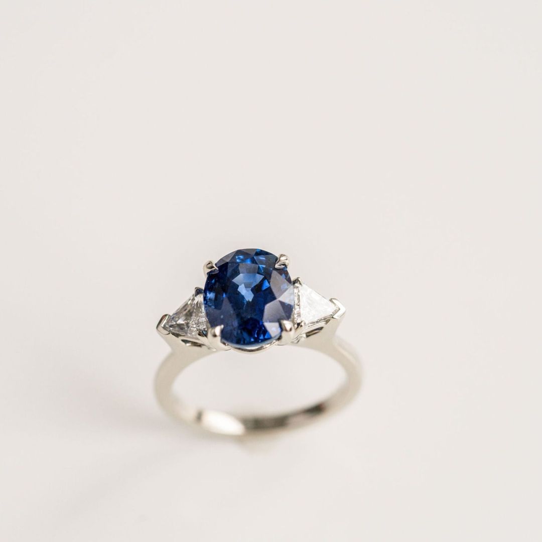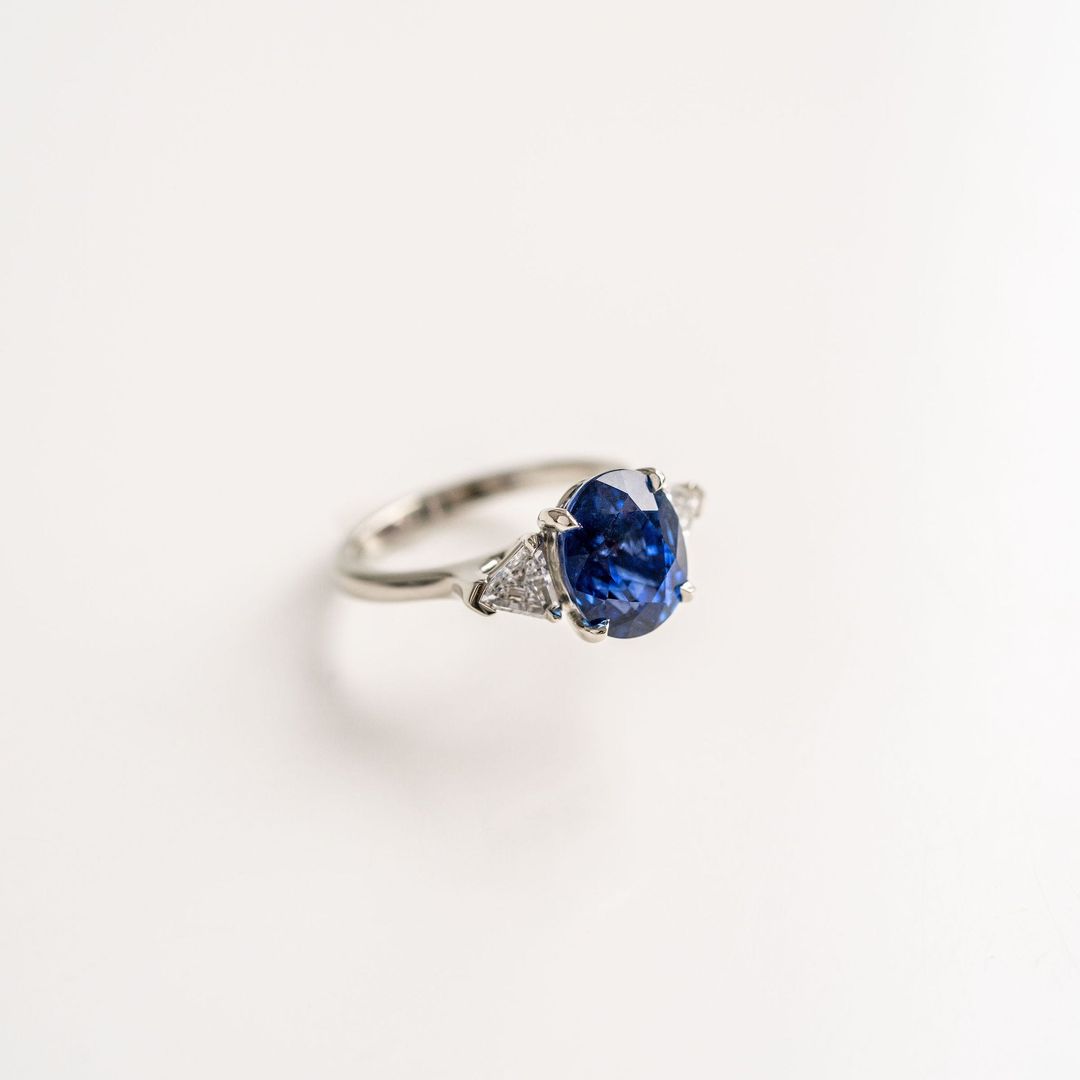 Truly a show-stopping piece. This plump blue oval Sri Lankan Sapphire is classy and eye catching in both it's colour and design, high-set with shield-shaped accent stones. Style as an unforgettable engagement ring or right hand accessory piece for any occasion.