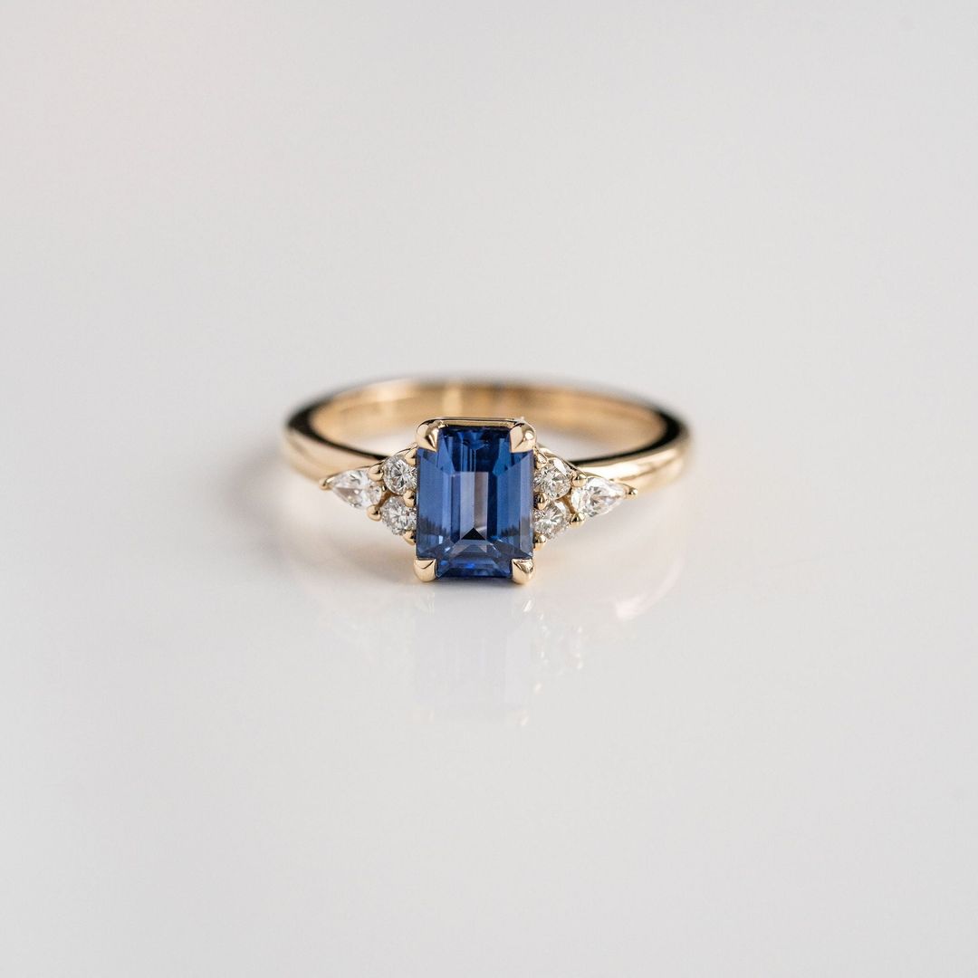 A traditional blue emerald cut Sri Lankan Sapphire with three-stone Diamond cluster accents made up of two round and one pear shape Diamond. Low-set for a subtle profile, this piece lay snug on your finger offering softer silhouette. Style as an engagement or right hand ring.