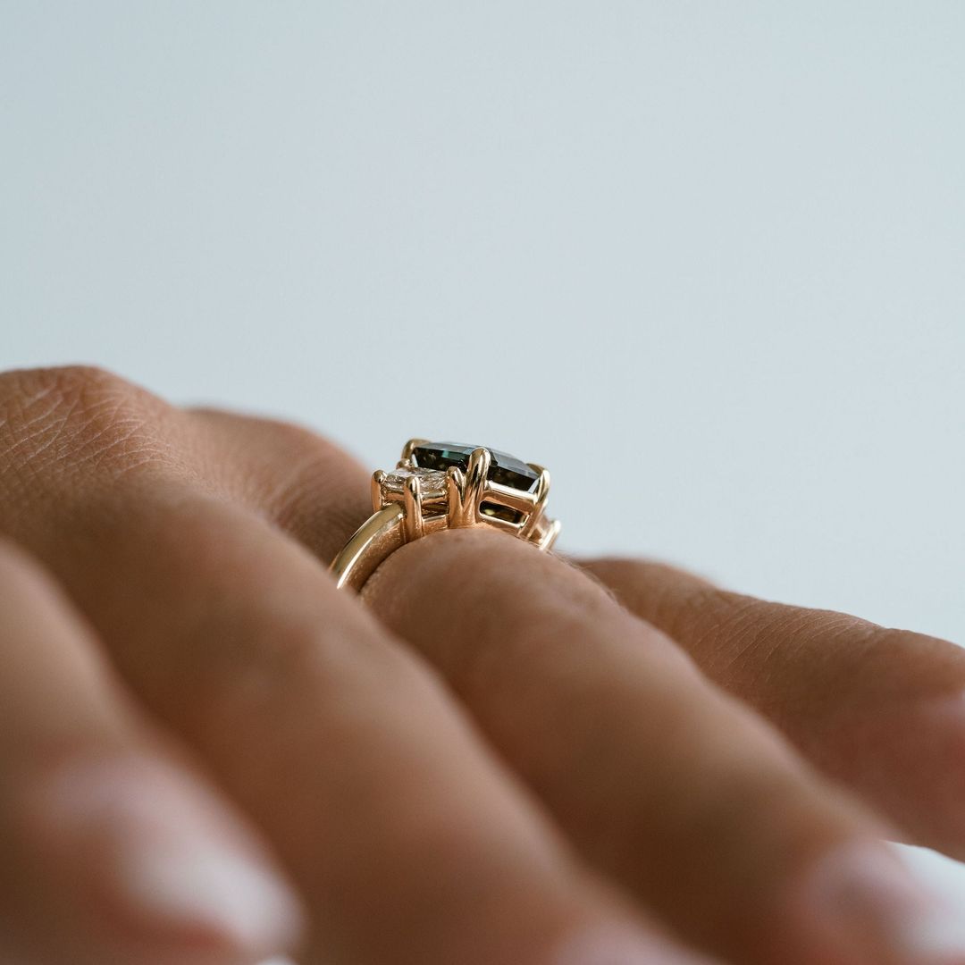 In one of our most adored colours, this square emerald cut blue-green Sri Lankan Sapphire is paired with brilliant cut Diamond trapezoid accents. The design is set low to the finger, creating a subtle, refined profile that emphasizes the stone's depth of colour. Style as an engagement or cocktail ring.