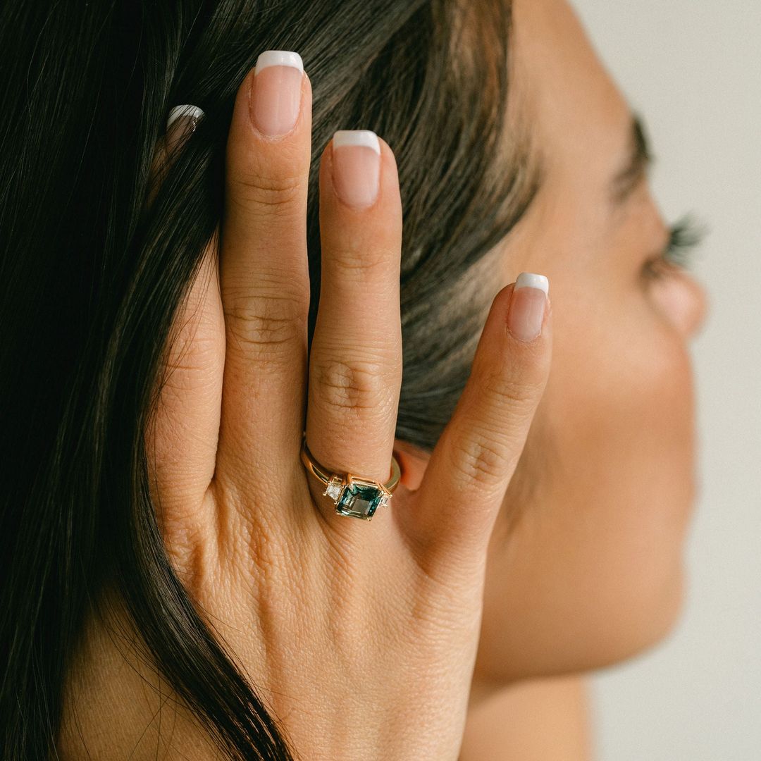 In one of our most adored colours, this square emerald cut blue-green Sri Lankan Sapphire is paired with step cut Diamond trapezoid accents. This piece is low-set which allows more subtle profile to the ring as the stone rests right on your finger. Style as an engagement or cocktail ring.
