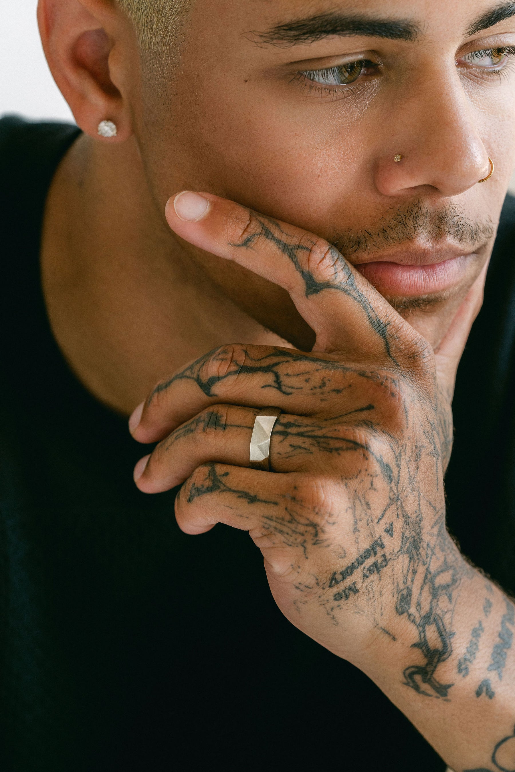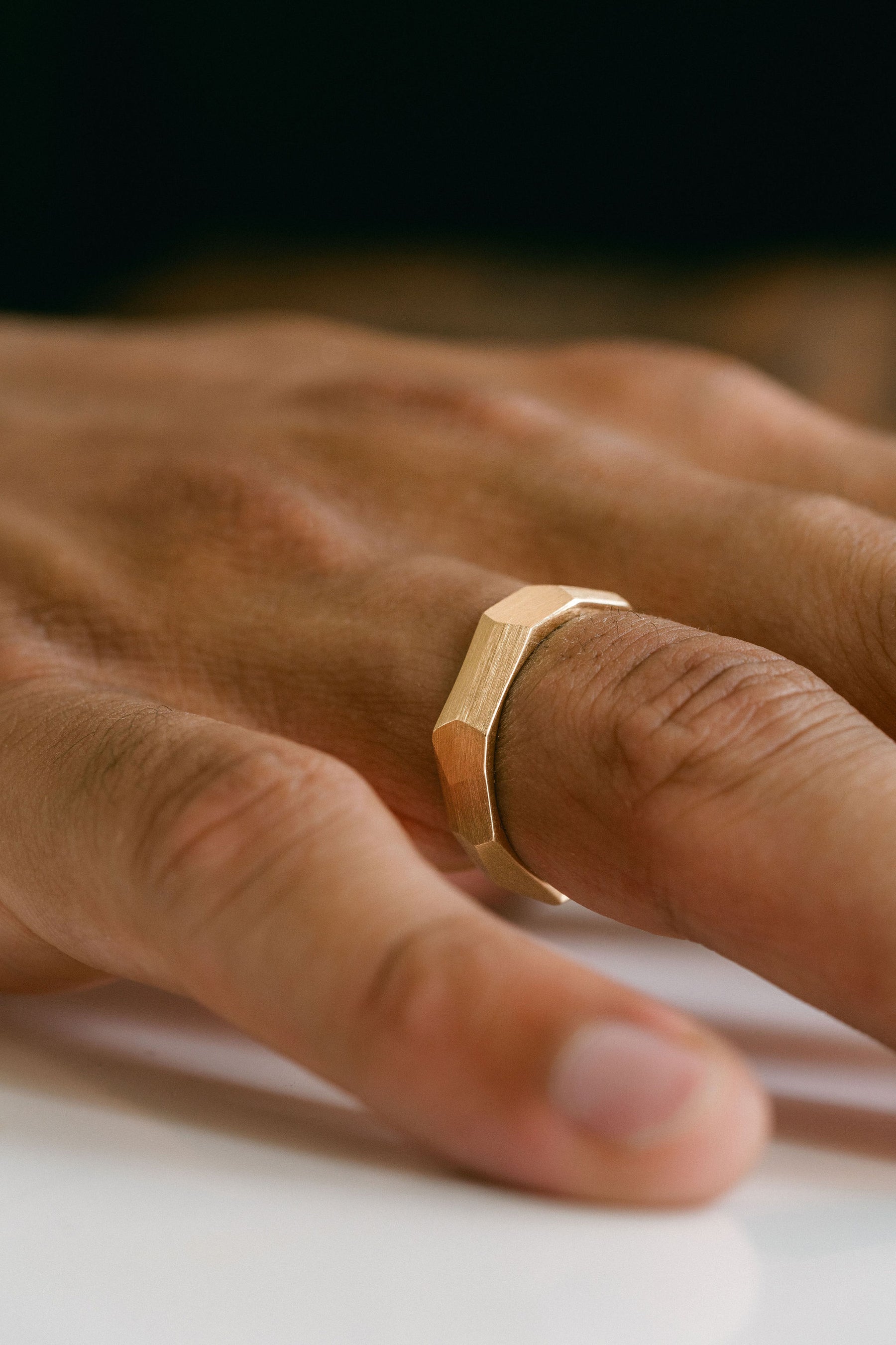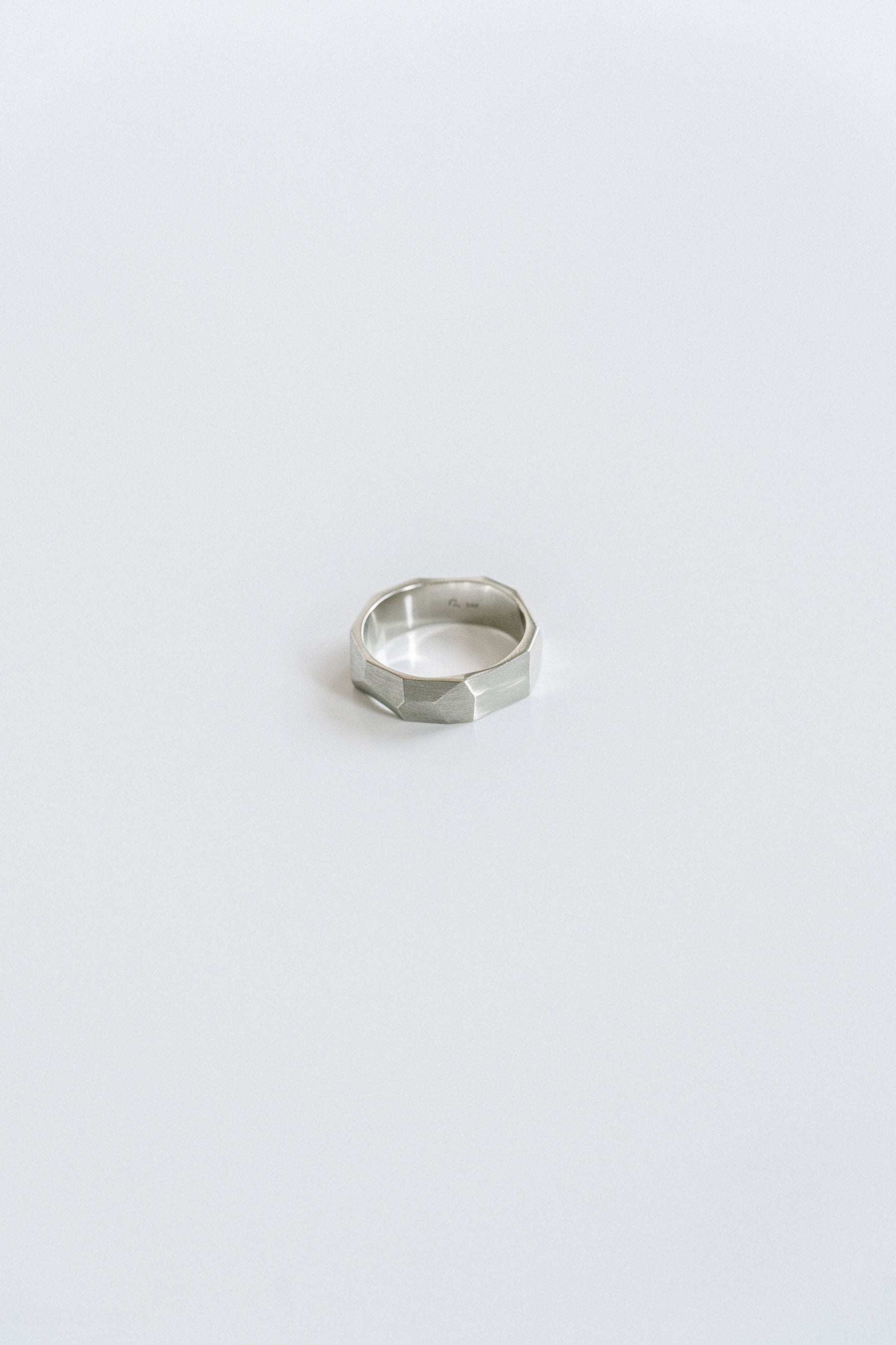 A faceted mens wedding band style with a brushed finish. Masculine and geometric in design, this pieces makes for an edgy wedding band or everyday accessory piece.