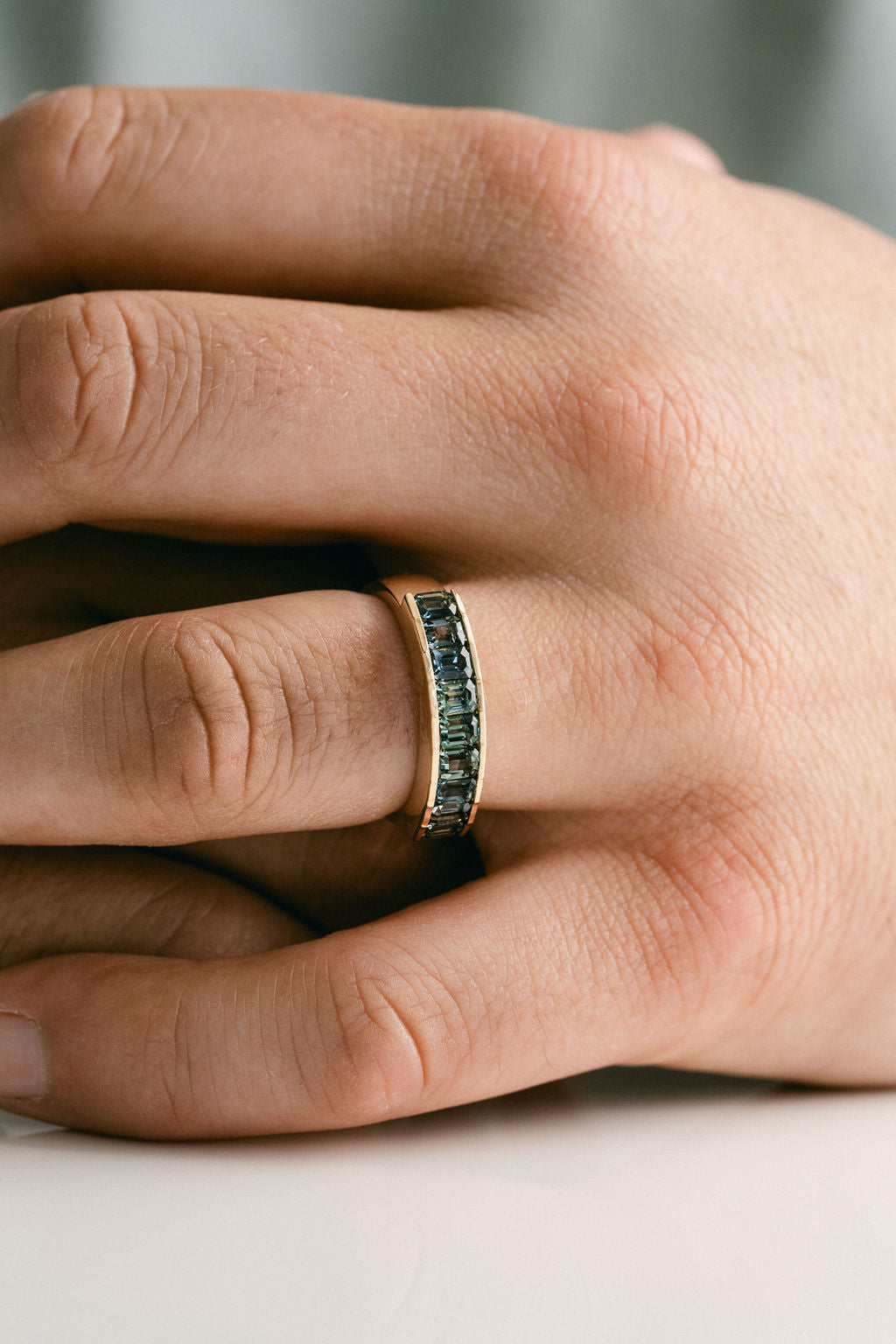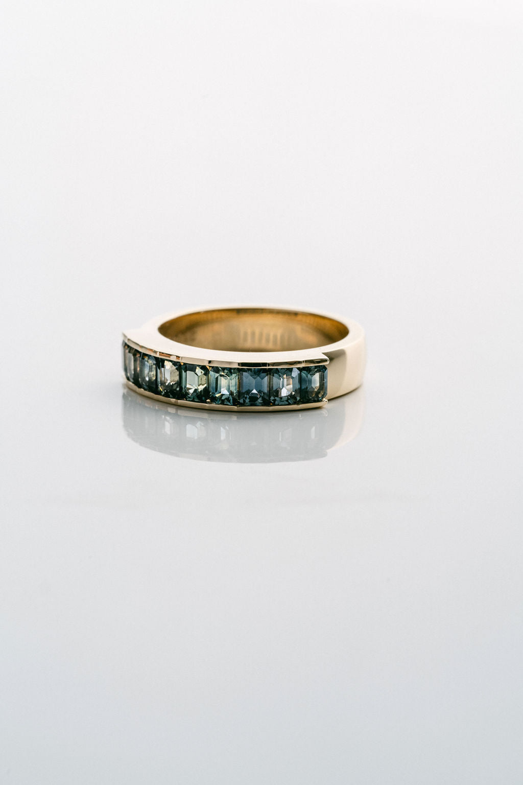 Mark the occasion with this 9-stone emerald cut Sri Lankan Sapphire gemstone band. Deep in blue-green tones, this elevated style will surprise you with how well it'll go with everything.
