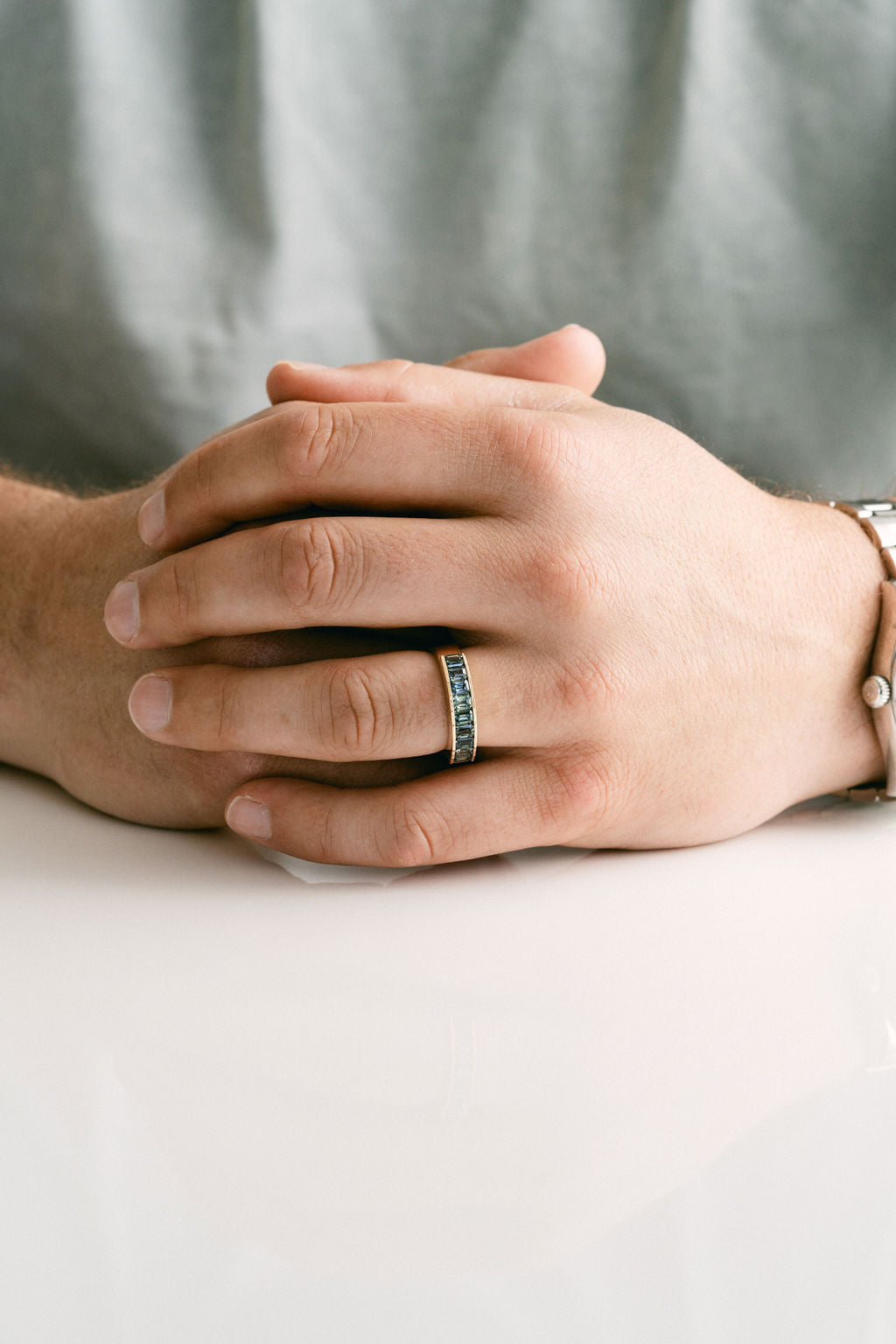 Emerald Cut Blue-Green Sapphire Channel Set Mens Band