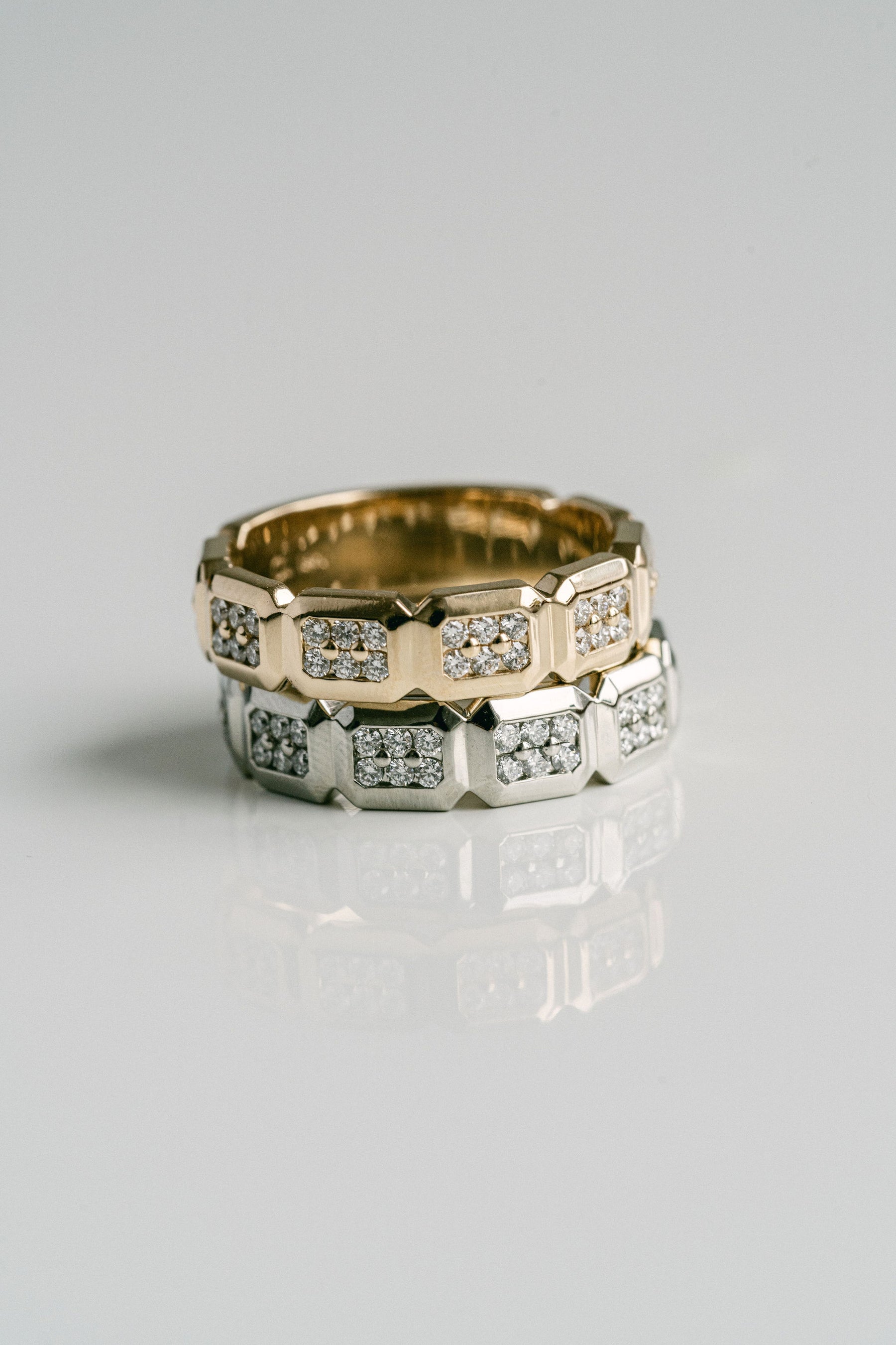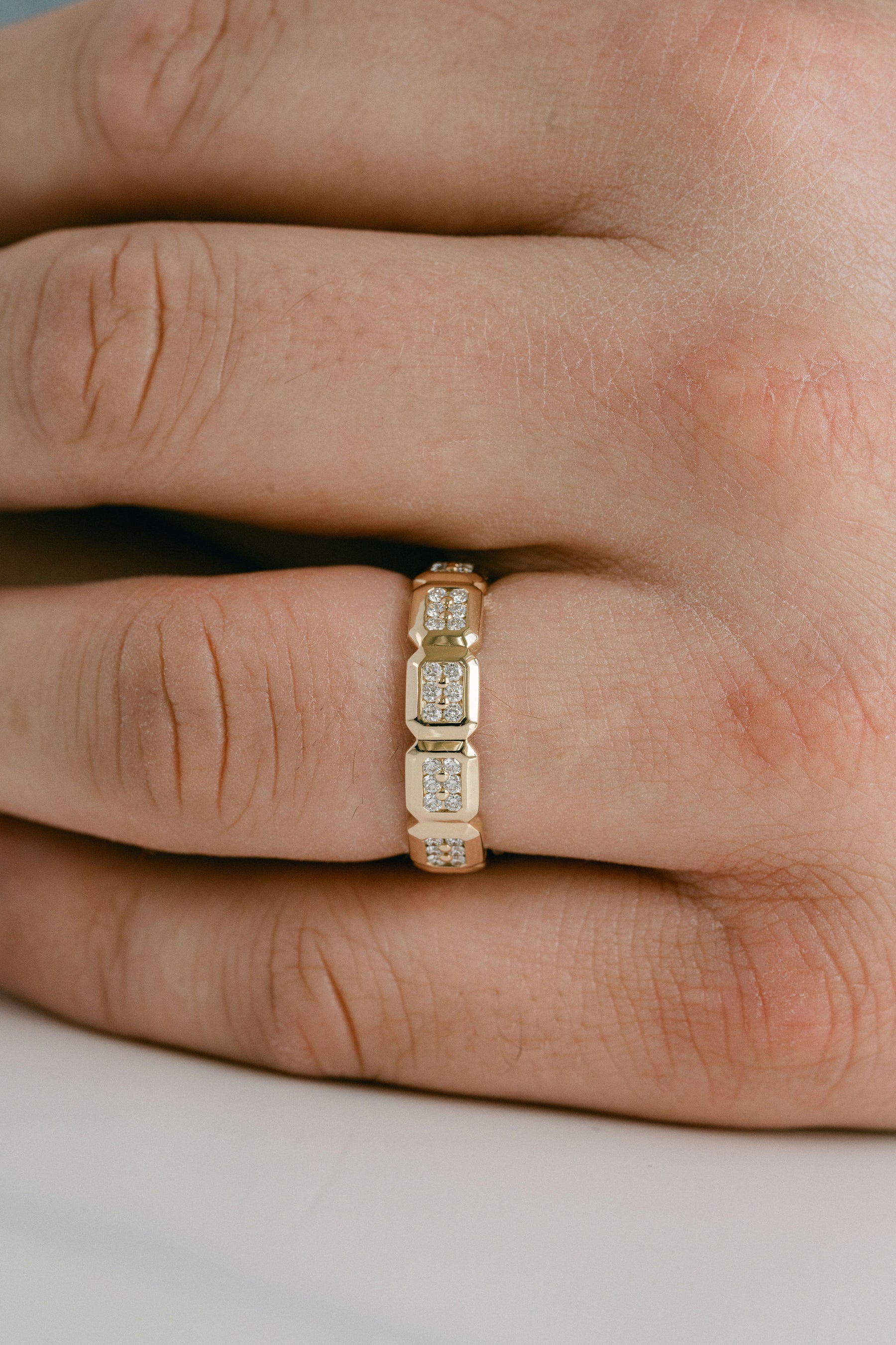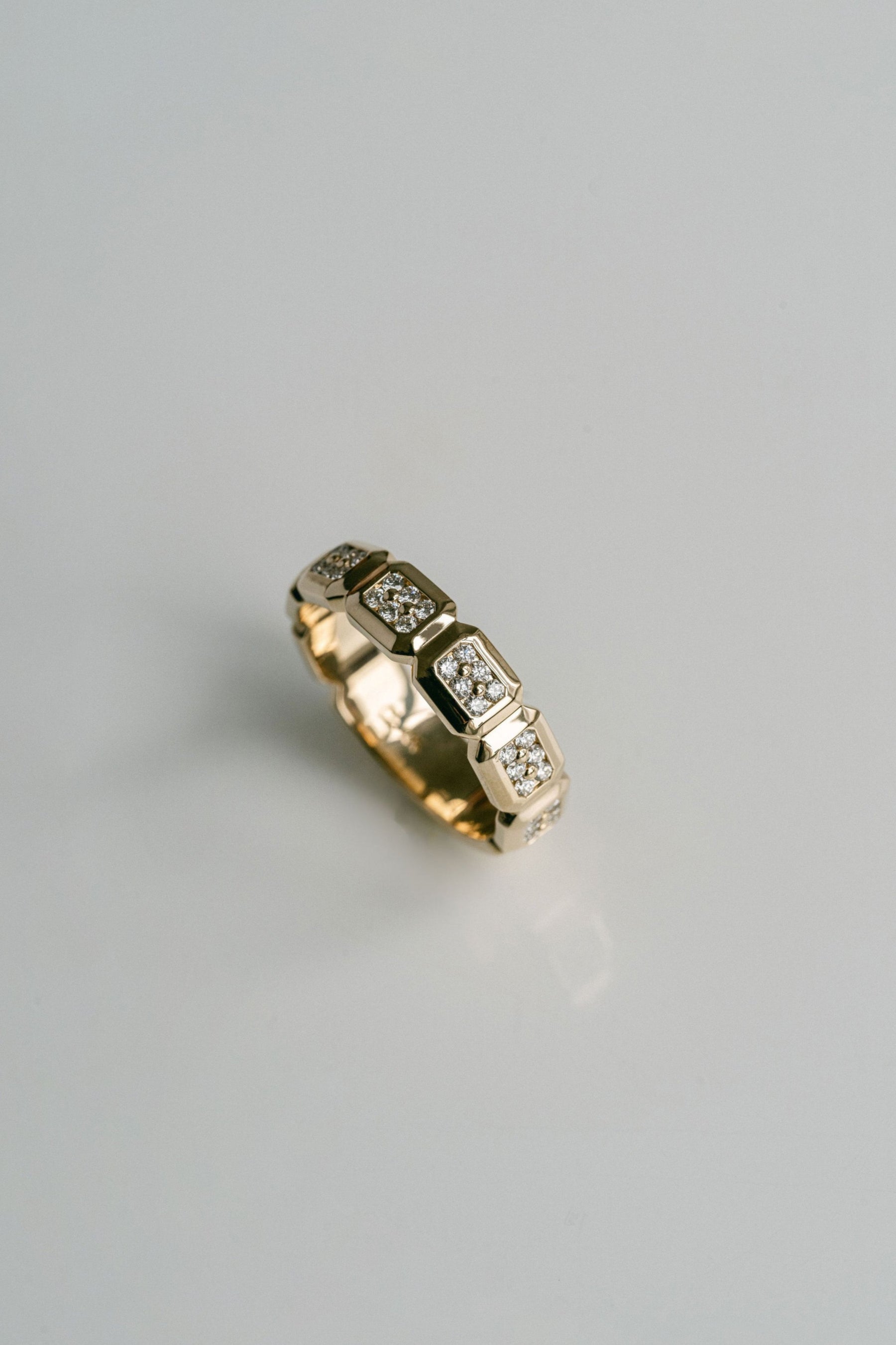 Solid gold mens-style wedding band with a geometric silhouette, each facet with 6 Diamond pavé stones around the top half of the band for a sharp detail. Style as a wedding band or accessory piece.