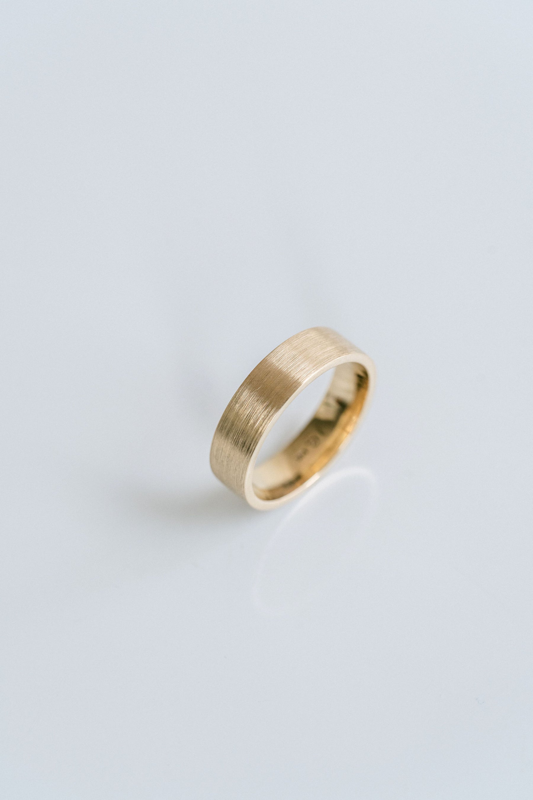 A solid gold, mens-style wedding band. Flat with a brushed finish for added texture to a classic piece. Style this as a wedding band or everyday accessory piece.