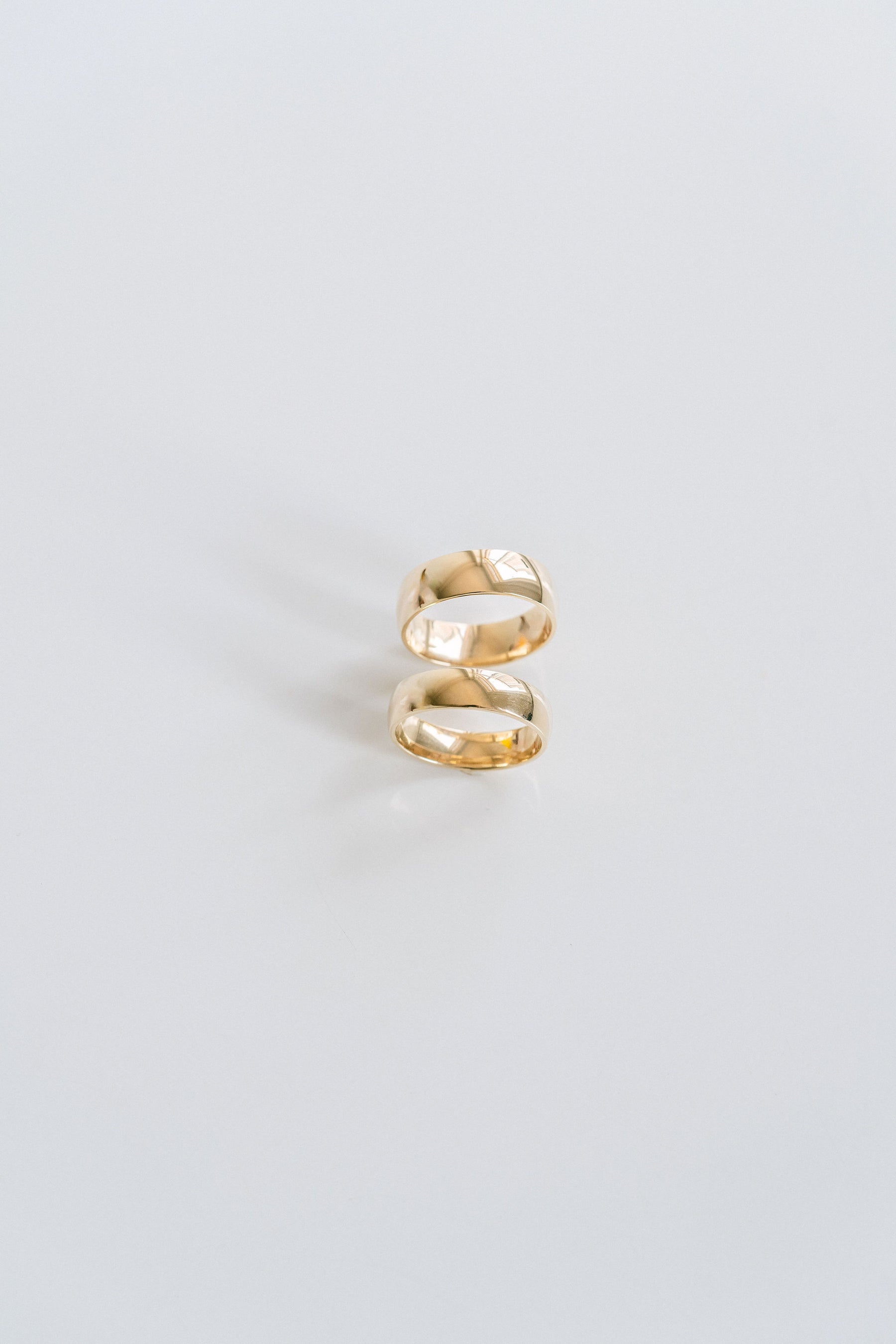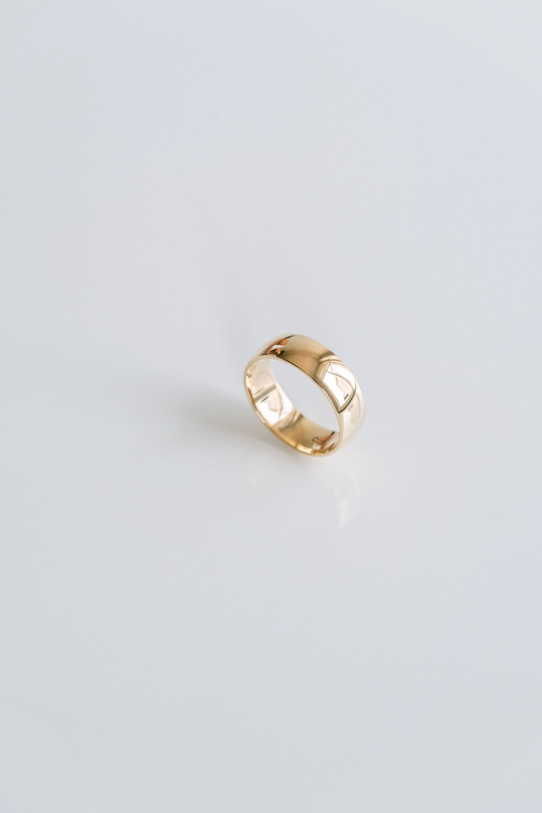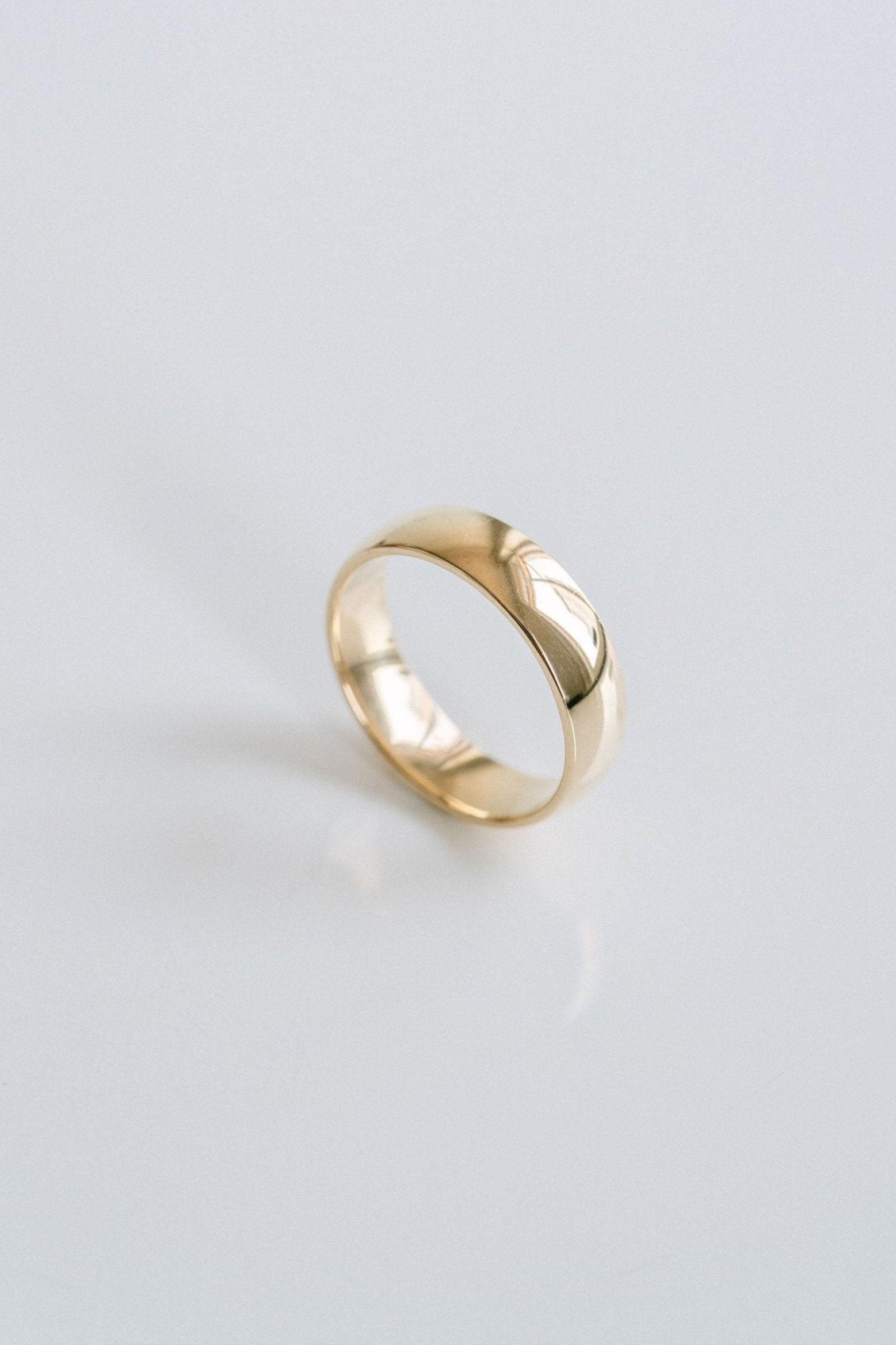A classic, solid gold, mens-style wedding band. Round and polished for a soft, smooth look. Style this as a simple wedding band or timeless accessory piece to add to your collection.