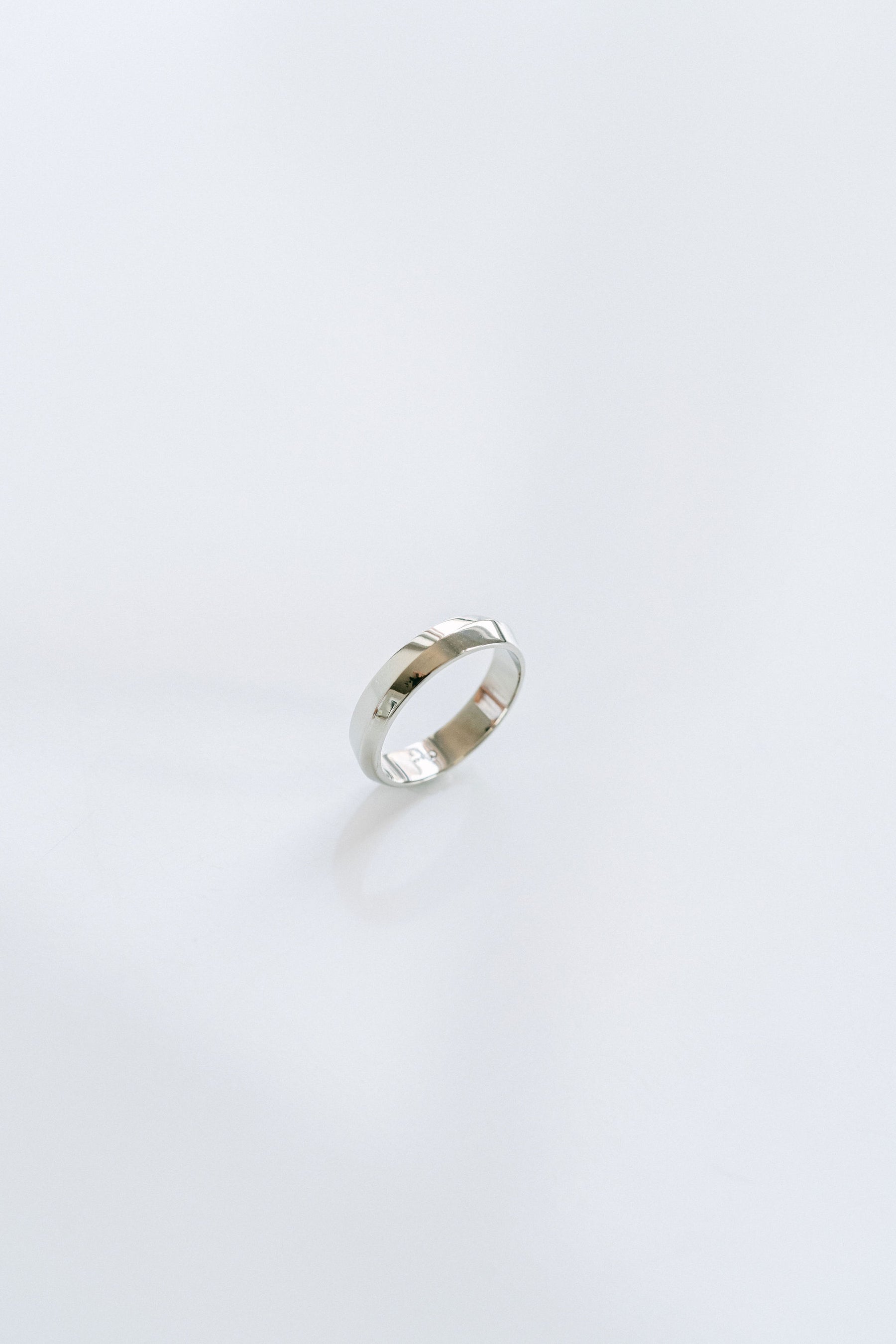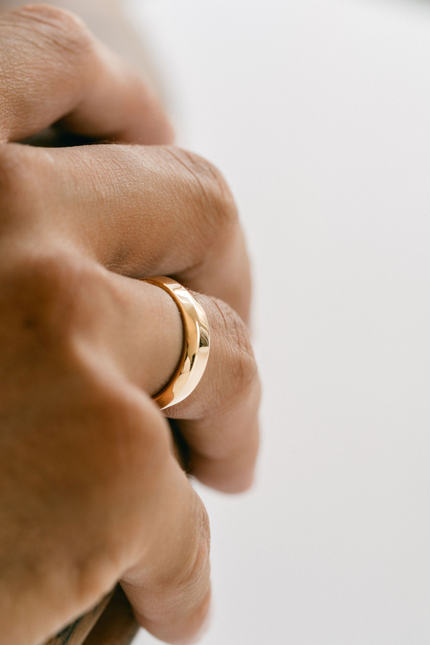 A subtle twist on a classic. This solid gold mens band is designed with an asymmetrical wave, or curve, through the centre of the band. Resembling a knife-edge detail, but softer and organic in it's look. Style this as a wedding band or an everyday accessory piece.