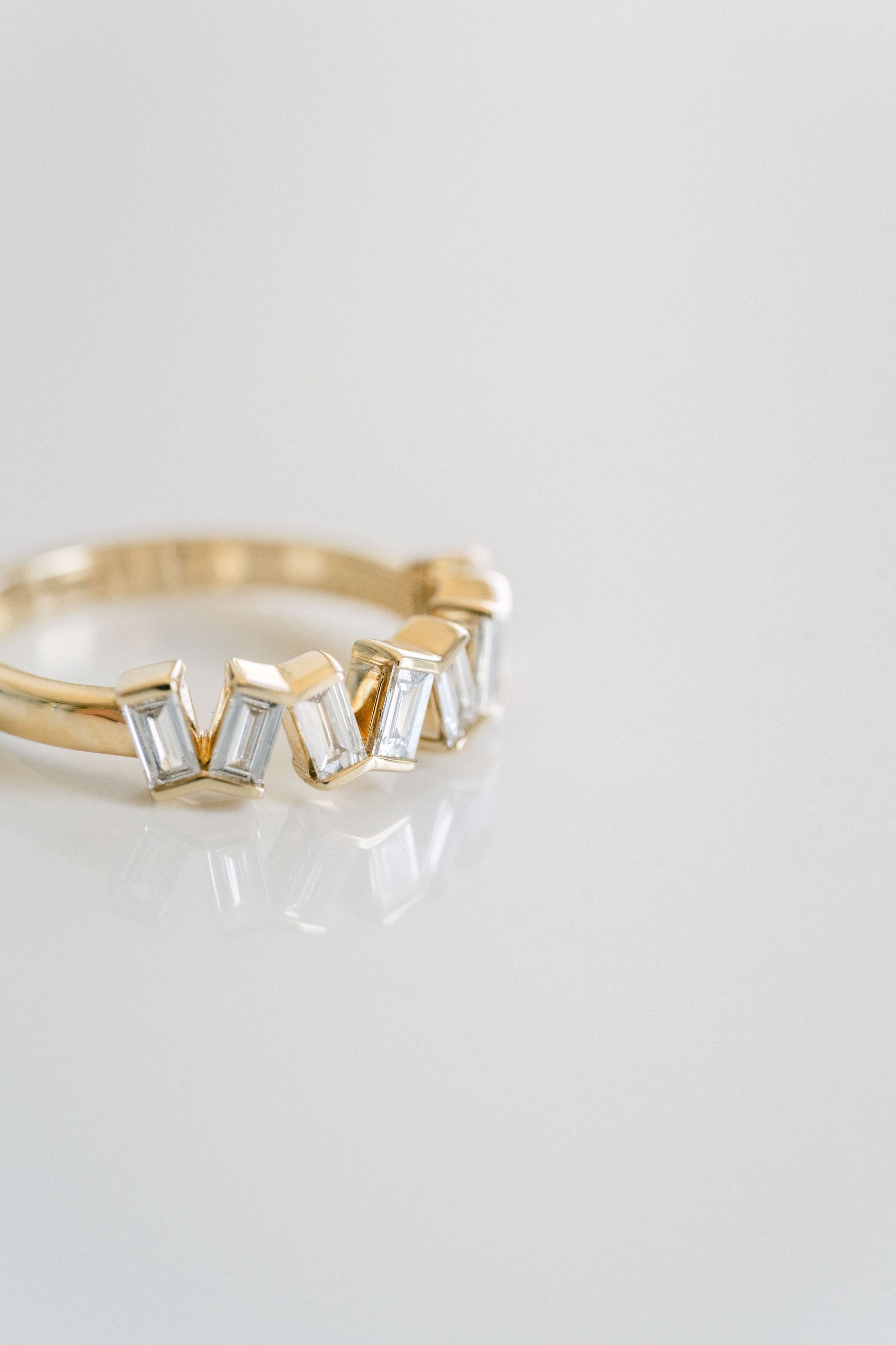 8 baguette cut Diamonds alternating in an angular, domino-style design with a bezel detail. A geometric and playful piece for a different take on a wedding band style.