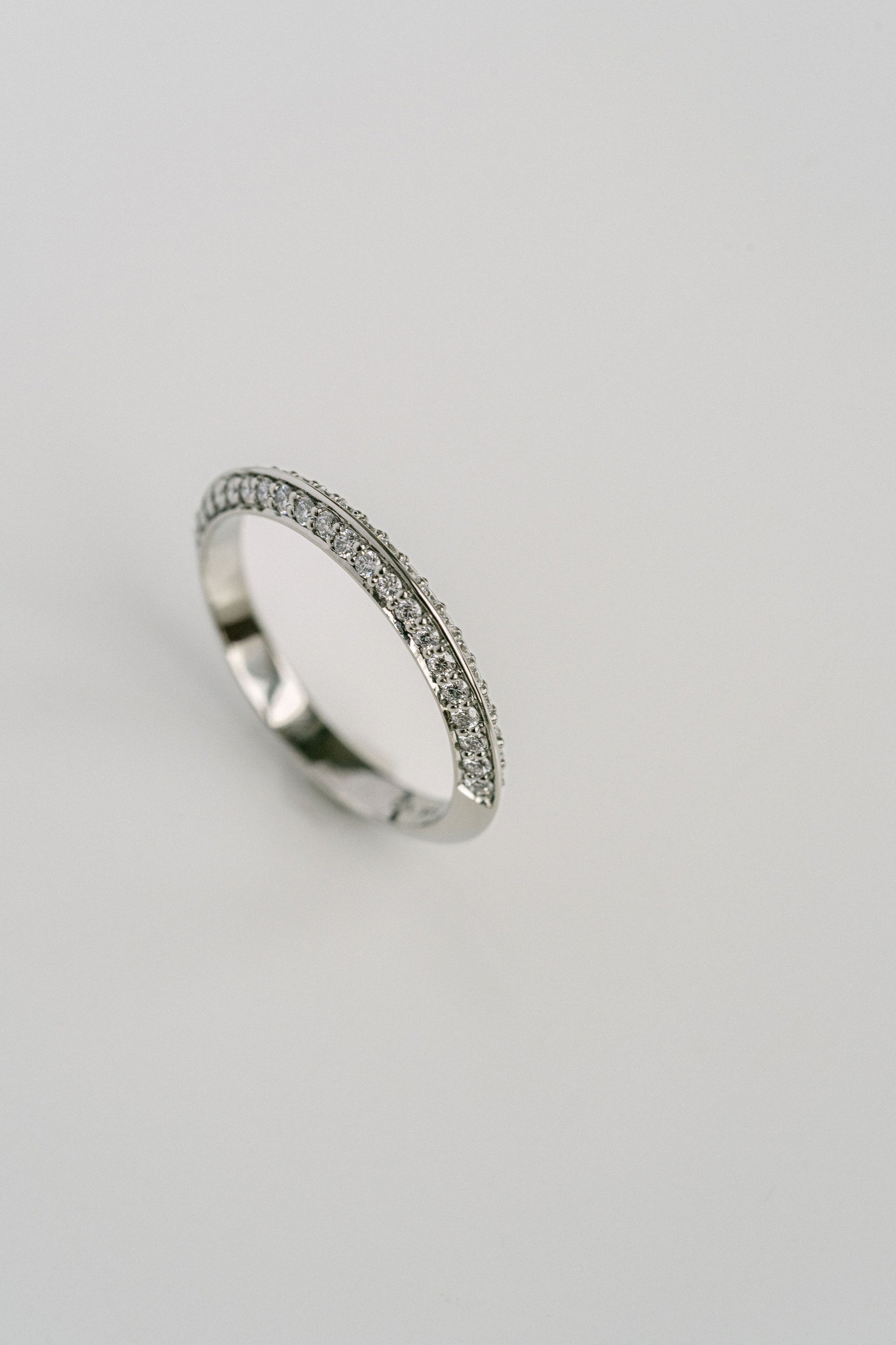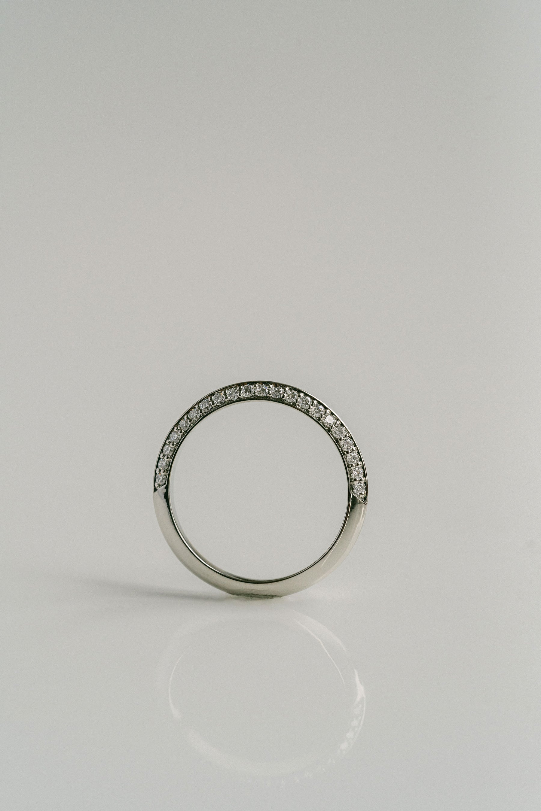 A knife-edge band with two rows of pavè Diamonds halfway around. The knife-edge detail offers a sharp look with a slim silhouette while still maintaining the structural integrity of the band. Style as a wedding band or stacking accessory piece.