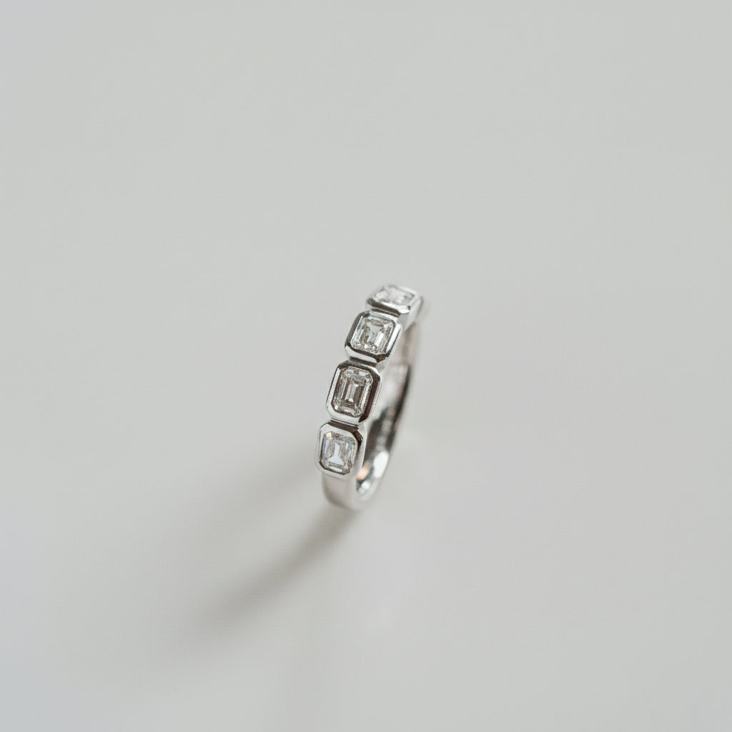 A 5-stone emerald cut Diamond bezel band, each stone east-west set and wrapped in gold offering additional security to suit a highly active lifestyle. Style as a gold-forward engagement band, wedding band or everyday accessory piece.