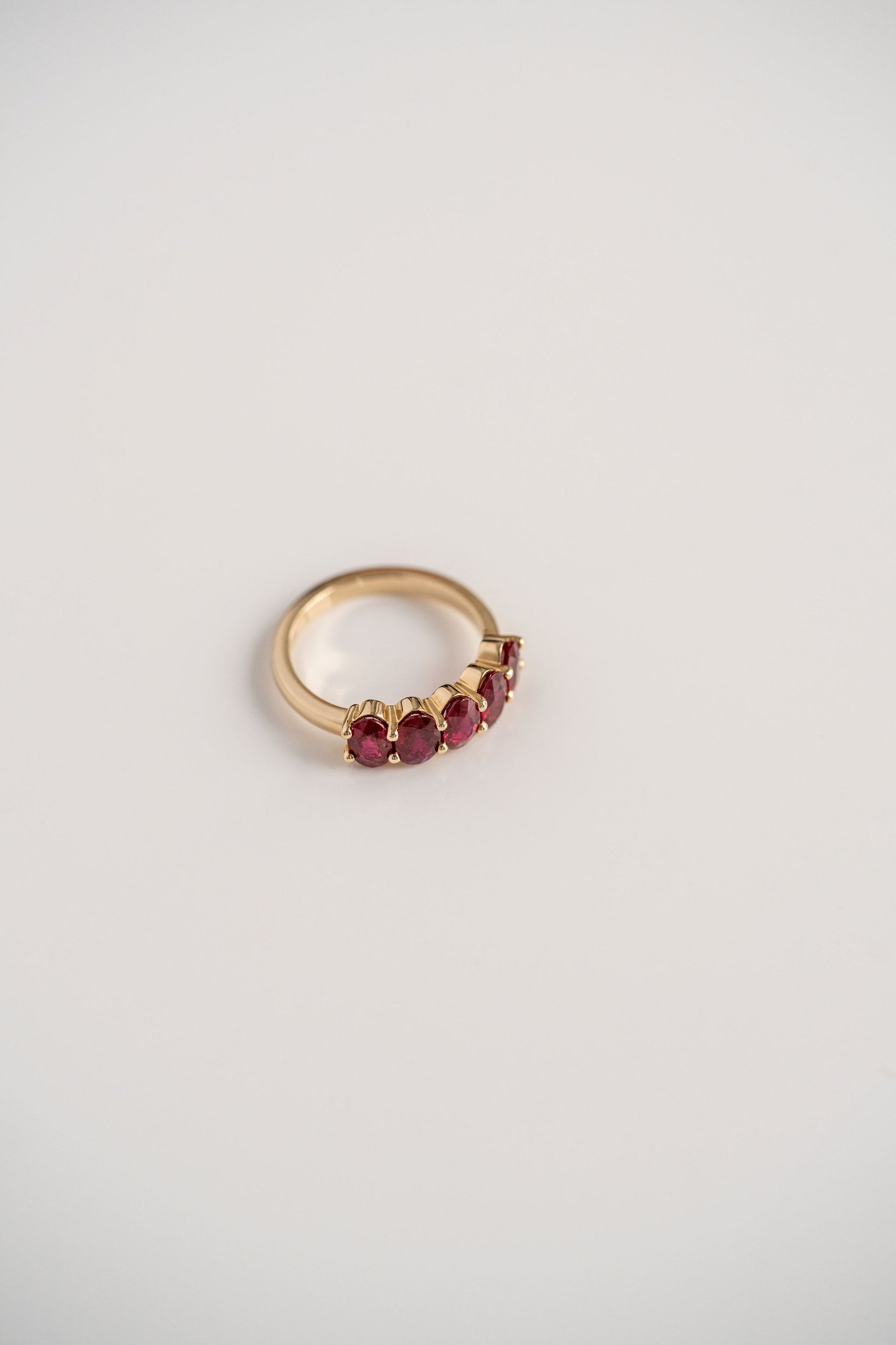 A 5-stone oval Ruby gemstone band. Each stone in this pairing is unique in their shape and colour, varying ever so slightly yet cohesive as a collective. Style as a stacking accessory ring, engagement band or wedding band.