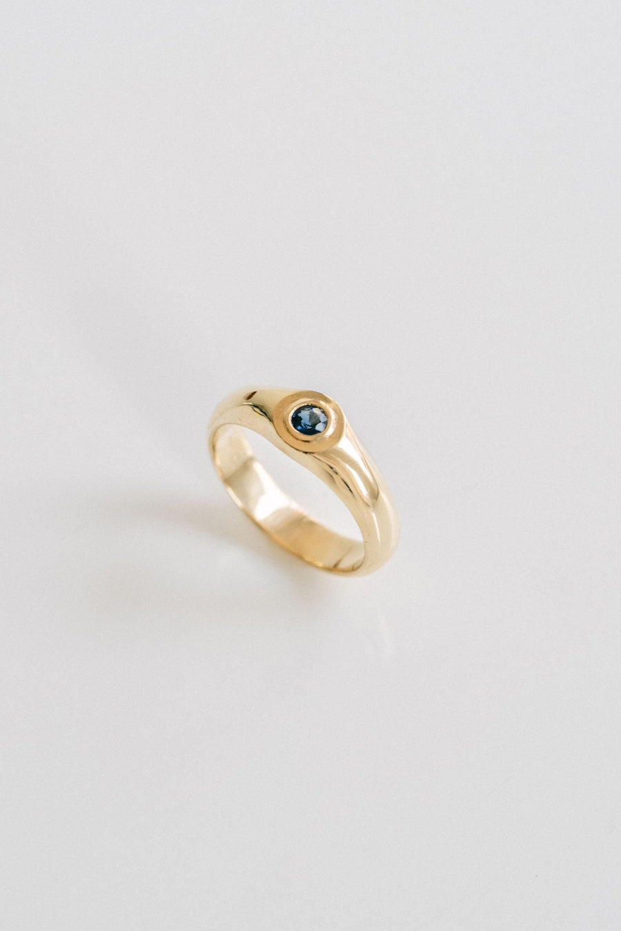 A slim, rounded signet ring with a round blue Sri Lankan Sapphire set in the centre. Style as a unique wedding band or everyday accessory piece.