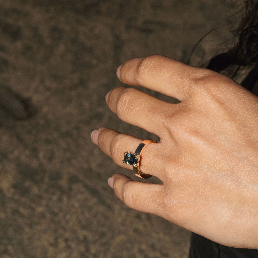 Emerald cut blue-green Sri Lankan Sapphire on a flat, wide polished band with a double prong detail. Soft and subtle details to spice up a traditional engagement ring style.