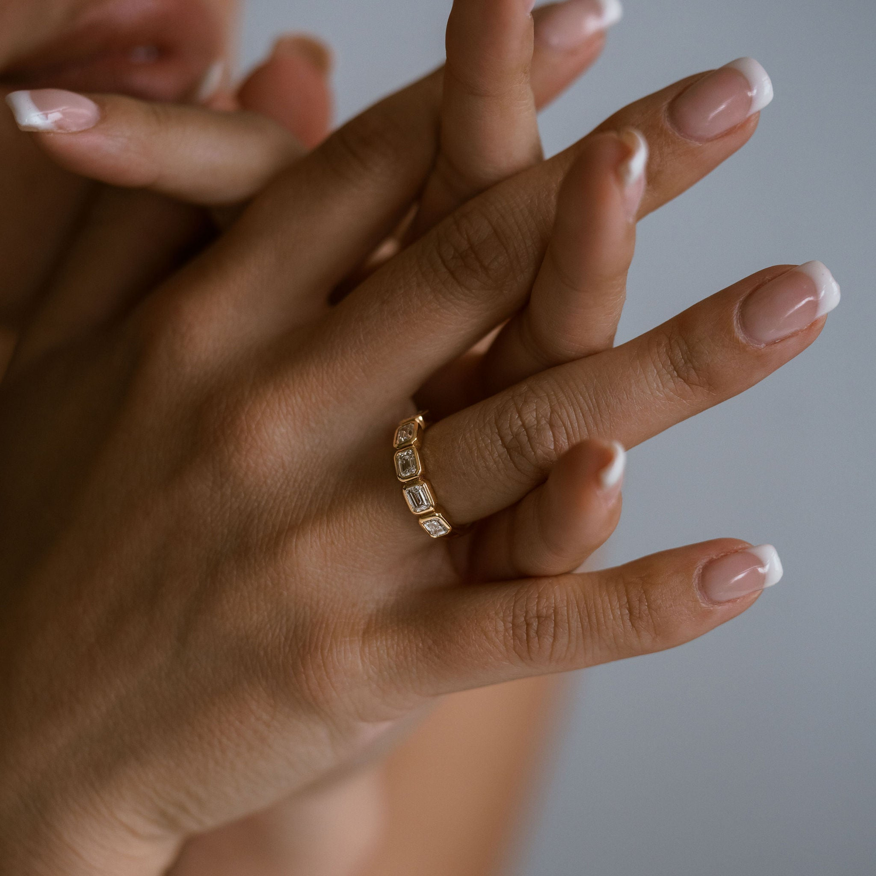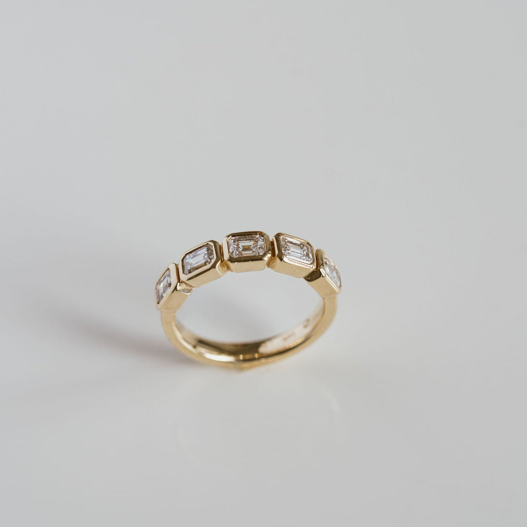 A 5-stone emerald cut Diamond bezel band, each stone east-west set and wrapped in gold offering additional security to suit a highly active lifestyle. Style as a gold-forward engagement band, wedding band or everyday accessory piece.