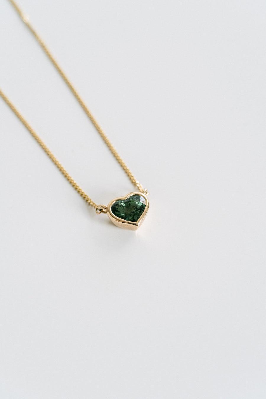 A special one to add to your collection. This heart-shape green Sri Lankan Sapphire is wrapped in a solid 14k yellow gold bezel, fixed onto a chain so it never leaves your chest centre.