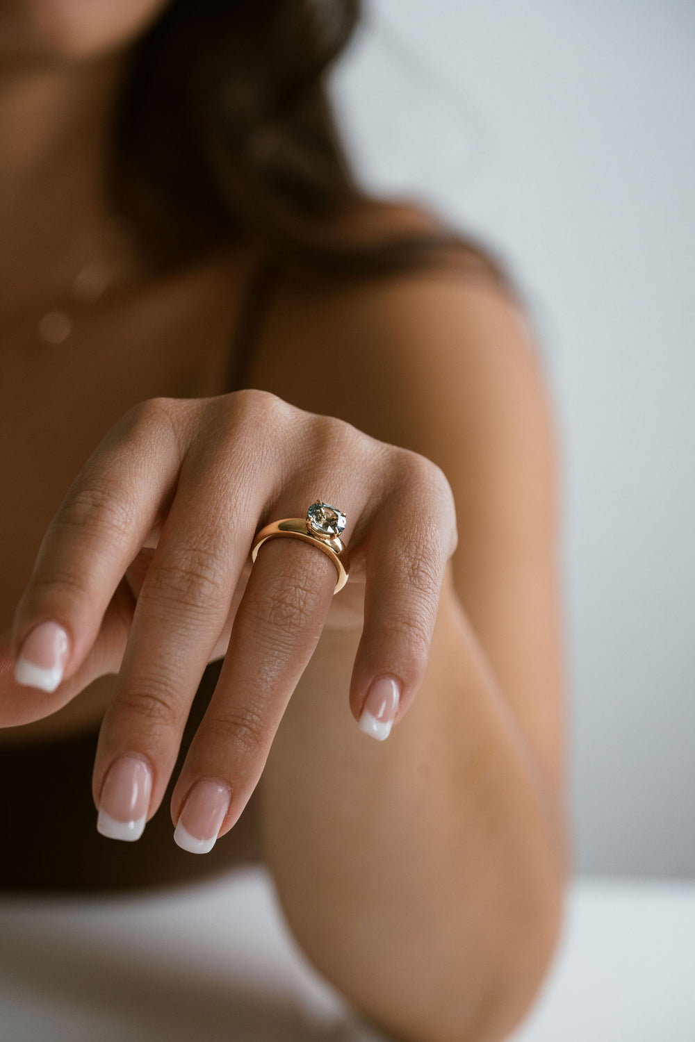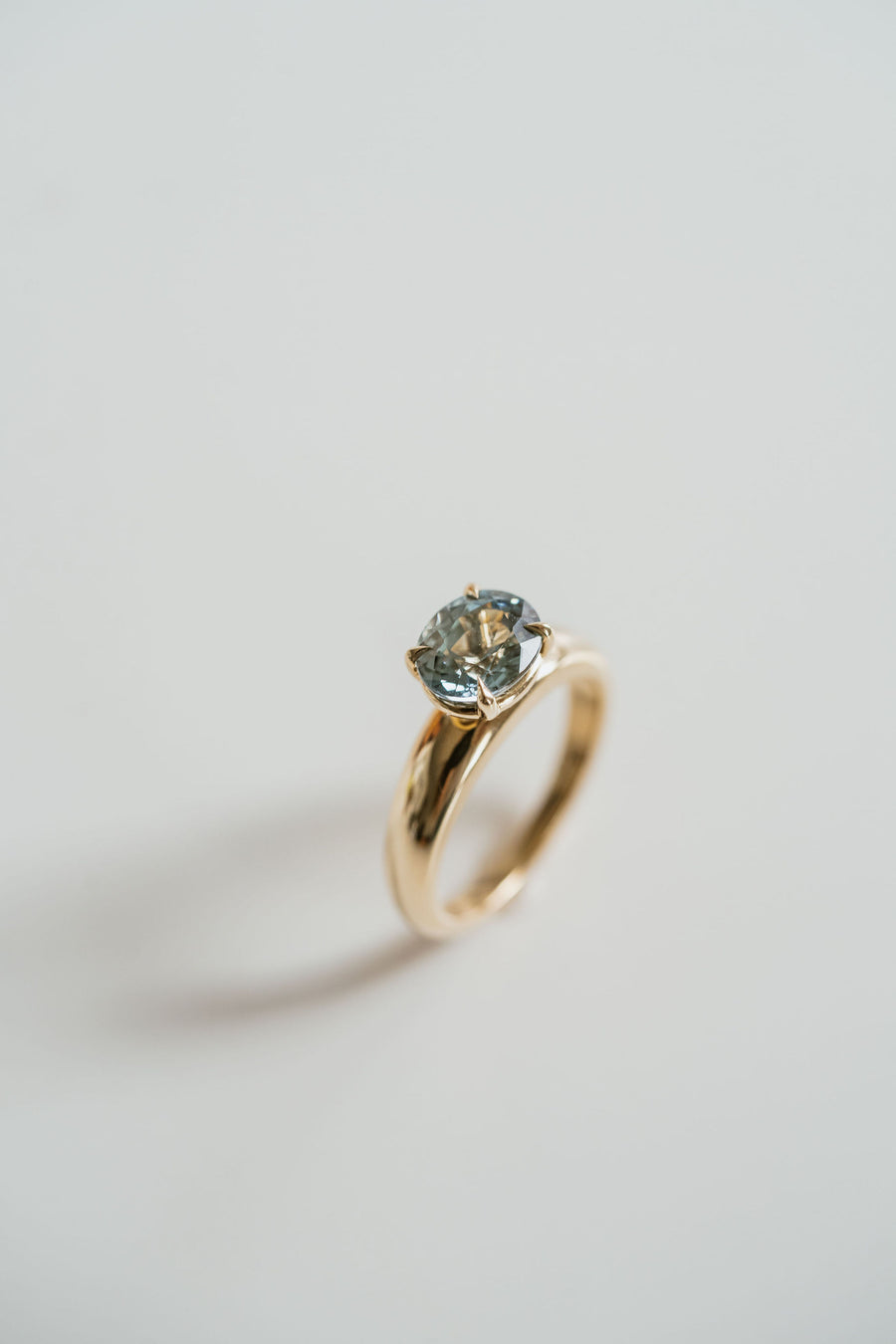 A reimagined oval gemstone engagement ring on our new Arc ring design with a light teal Sri Lankan Sapphire centre stone. The tapered domed band offers a smooth, balanced fit, pairing seamlessly with our new Arc Band. Style as a classic engagement ring.