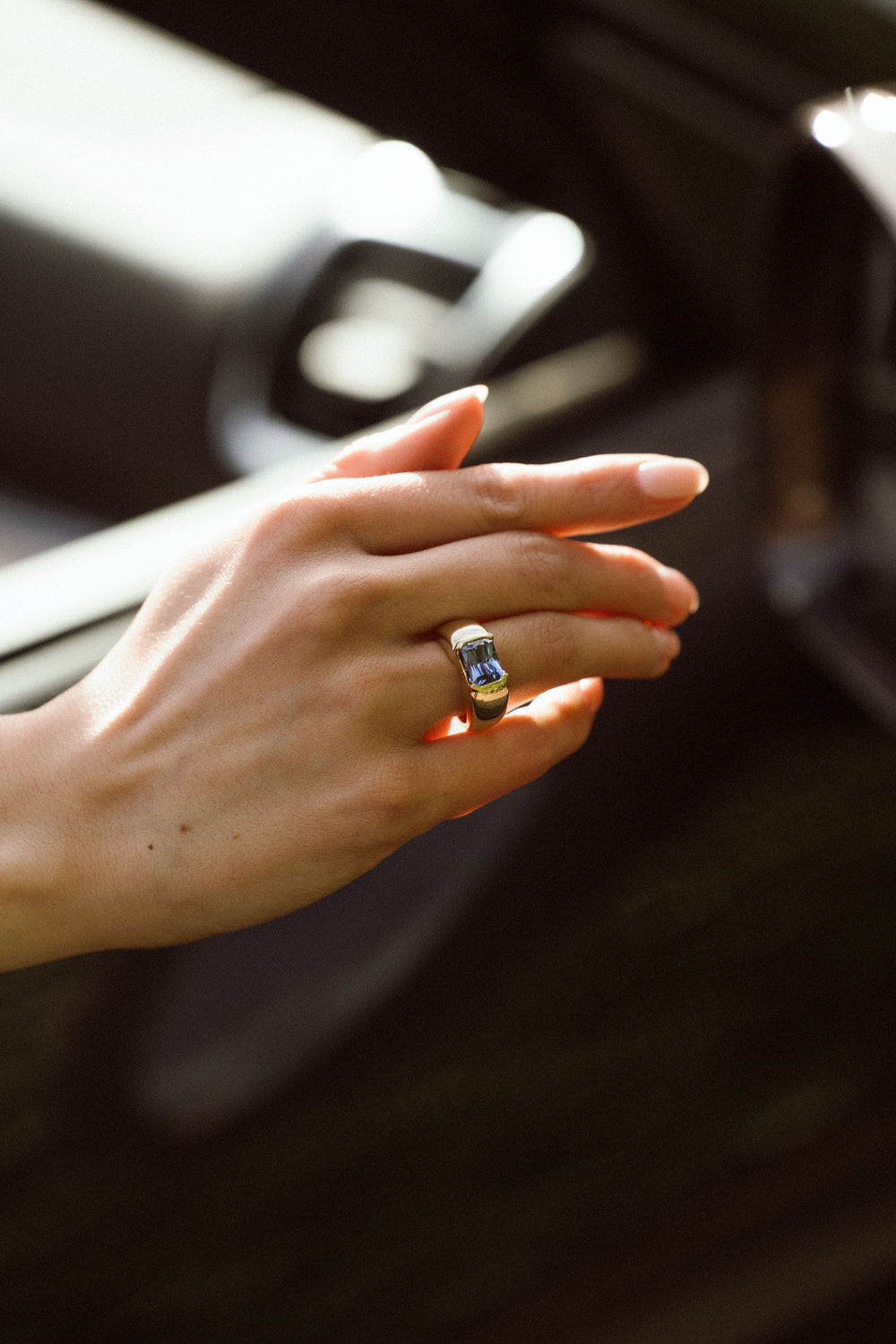 An east-west set radiant cut blue Sri Lankan Sapphire in our half bezel Haven ring setting. The soft, domed curves of this tapered band style come together in a low setting with side cut outs to offer enhance brilliance and light entry into the stone. Note the width of the stone follows the width of the band, creating a straight, masculine edge, ideal for stacking. Style as a chunky engagement ring or colourful cocktail piece to add to your collection.